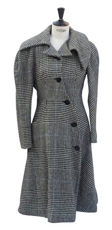 Cappotto redingote asimmetrico realizzato in tessuto Harris Tweed con disegno Principe di Galles, foderato con imbottitura trapuntata, lunghezza al polpaccio, bottoni giganti con logo Orb. Tasche, made in England. autunno/inverno 1996. UK taglia 10. Perfettamente conservato.