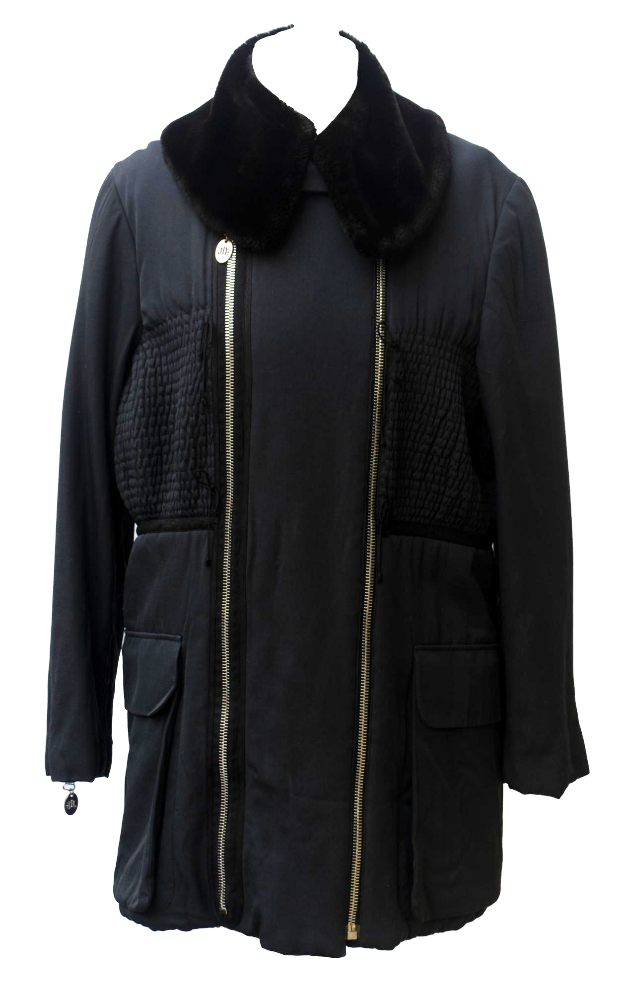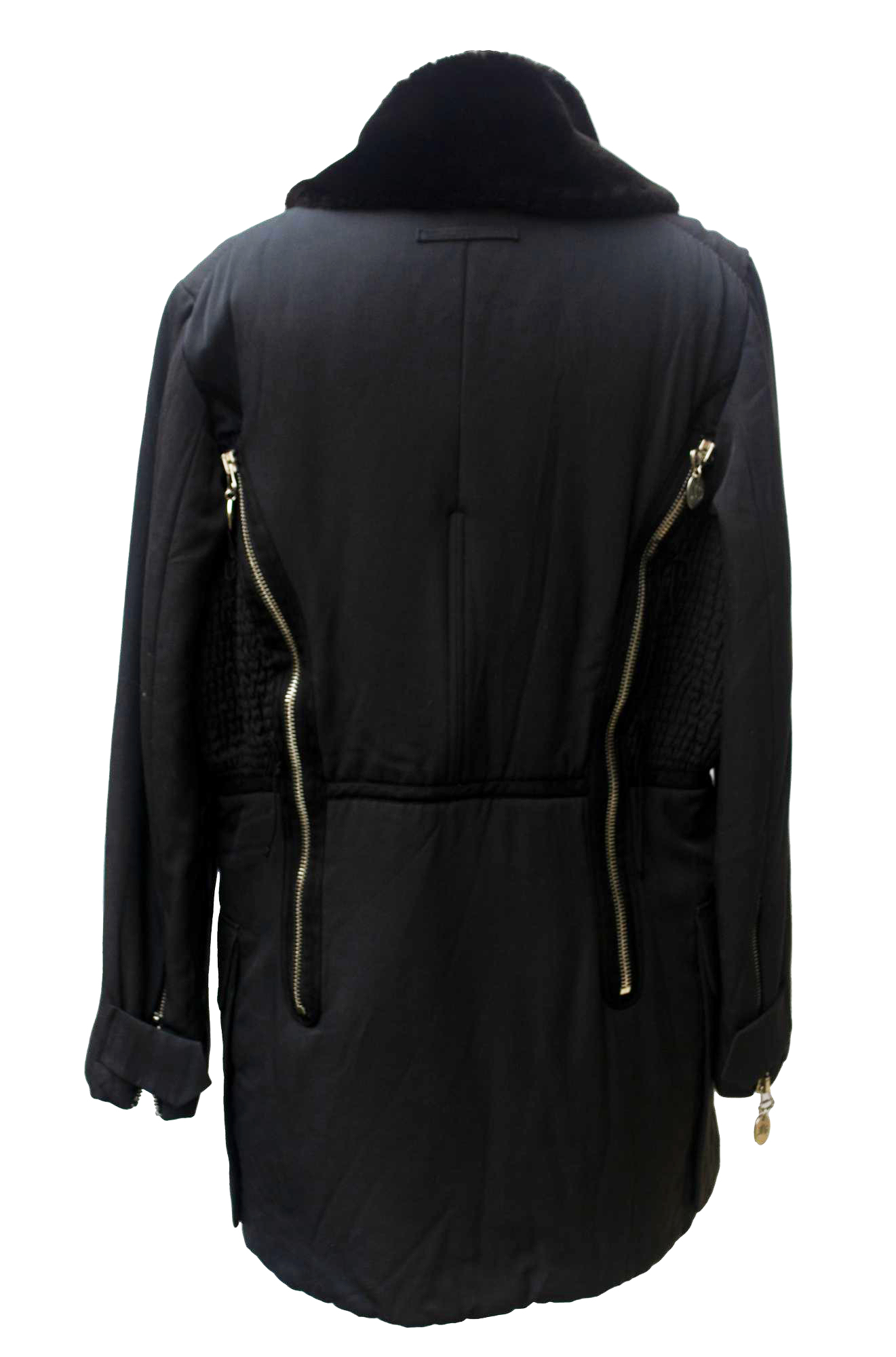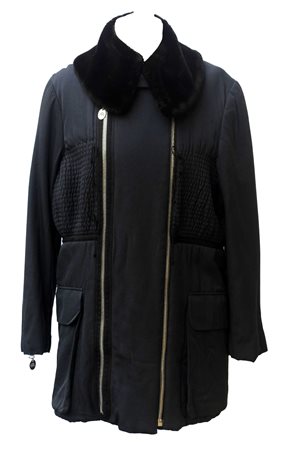 Dark gray wool caban lined in eco fur. Long zips running through the length and in the sleeves are making stronger the look of the caban, big patch pockets with flaps, eco fur collar, embossed effect on both side of the bust. Custom zip pullers. Made in Italy 80s. Size IT 42. Excellent condition.
