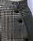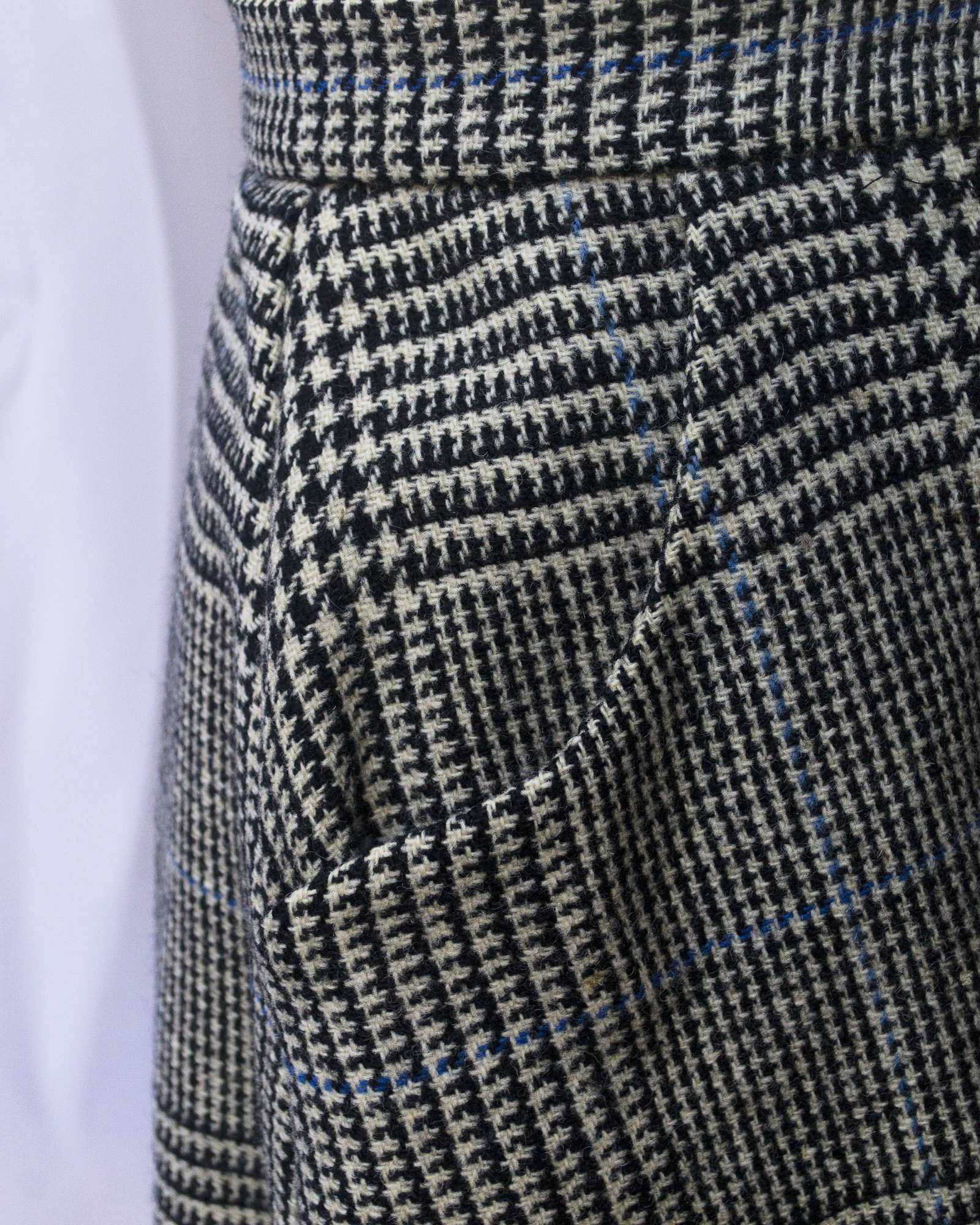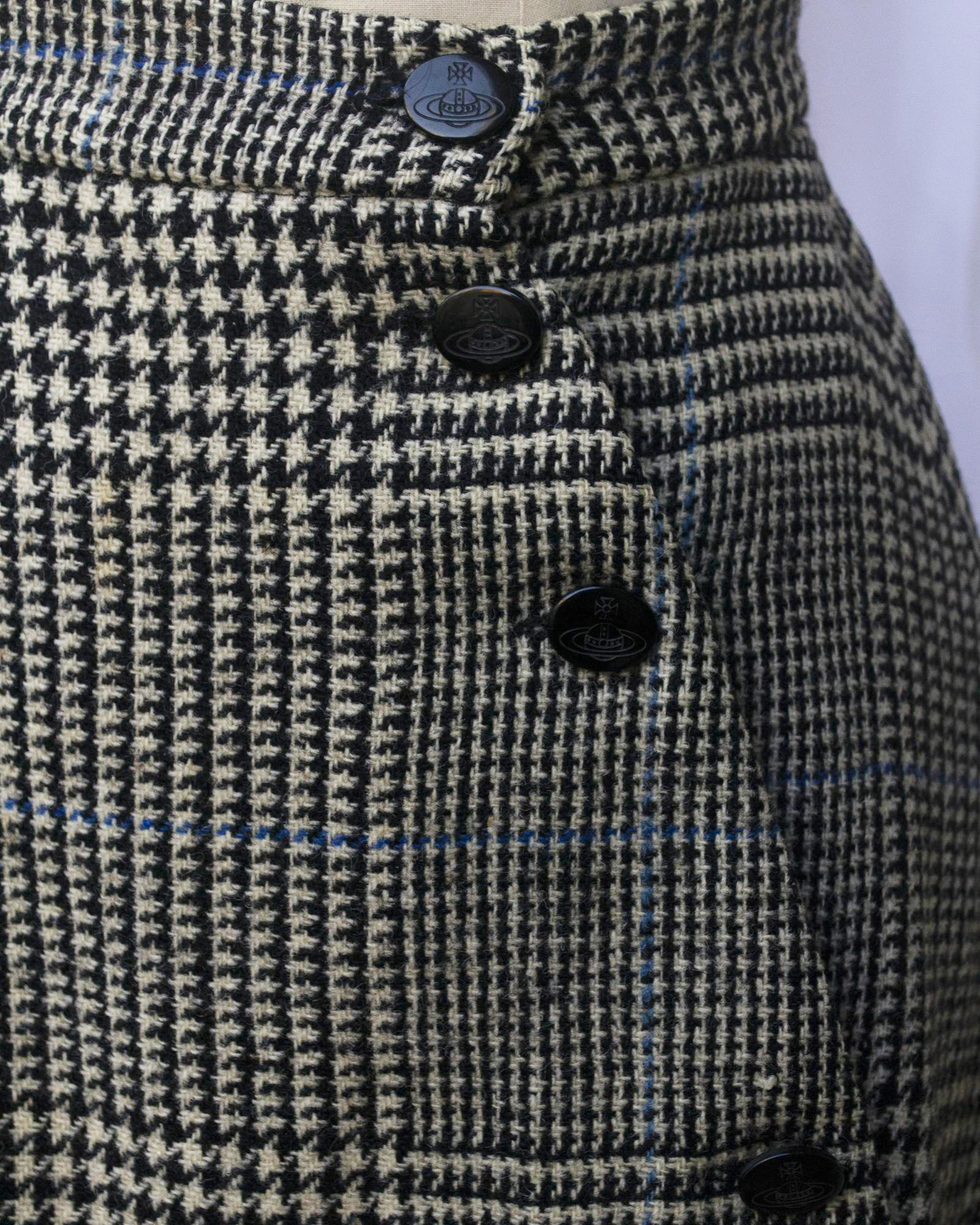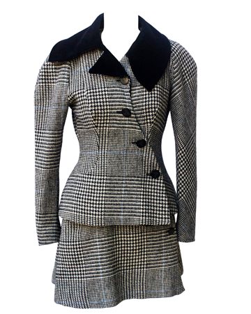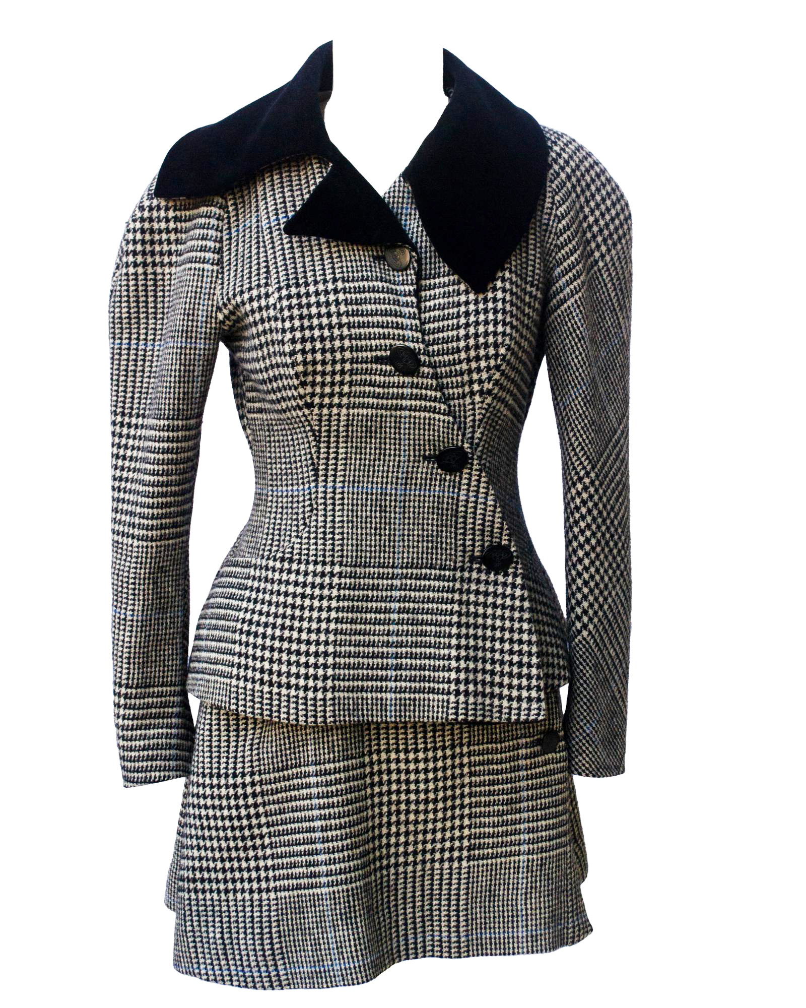 Completo asimmetrico realizzato in tessuto Harris Tweed con fantasia Principe di Galles, collo e revers in velluto nero. Giacca con spalline e taschino e gonna a trapezio con tasca abbottonata davanti come la giacca, foderata in rosa pallido, bottoni neri con logo Orb. Made in England, autunno/inverno 1996.Taglia UK 10. Perfettamente conservato.