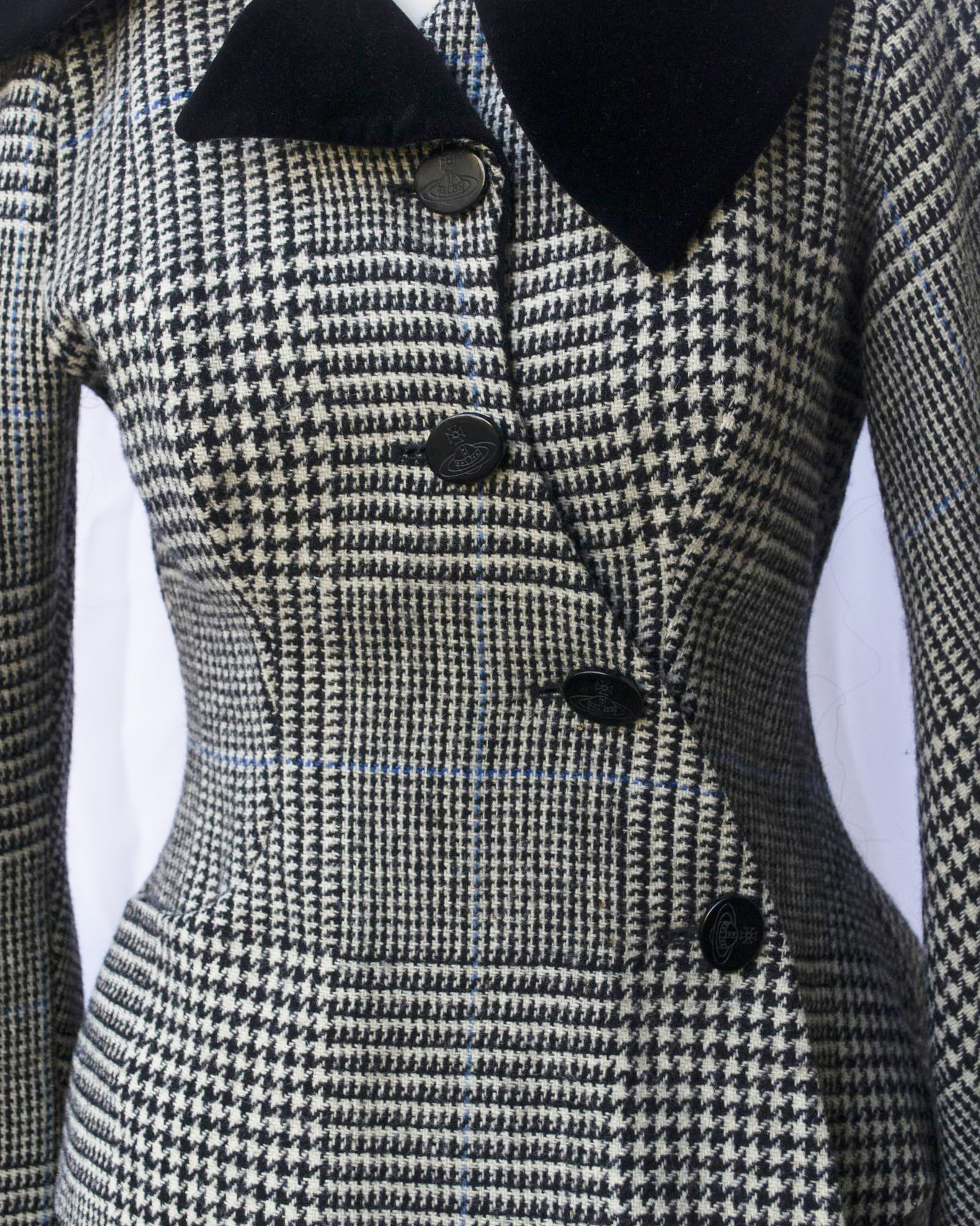 Asymmetrical suit made in Harris Tweed fabric with Prince of Wales design, collar and lapels in black velvet. Jacket with shoulder pads and pocket and an a-line skirt with pocket buttoned in the front as the jacket, lined in pale pink, black buttons with Orb logo. Made in England fall/winter 1996.UK size 10. Perfectly preserved