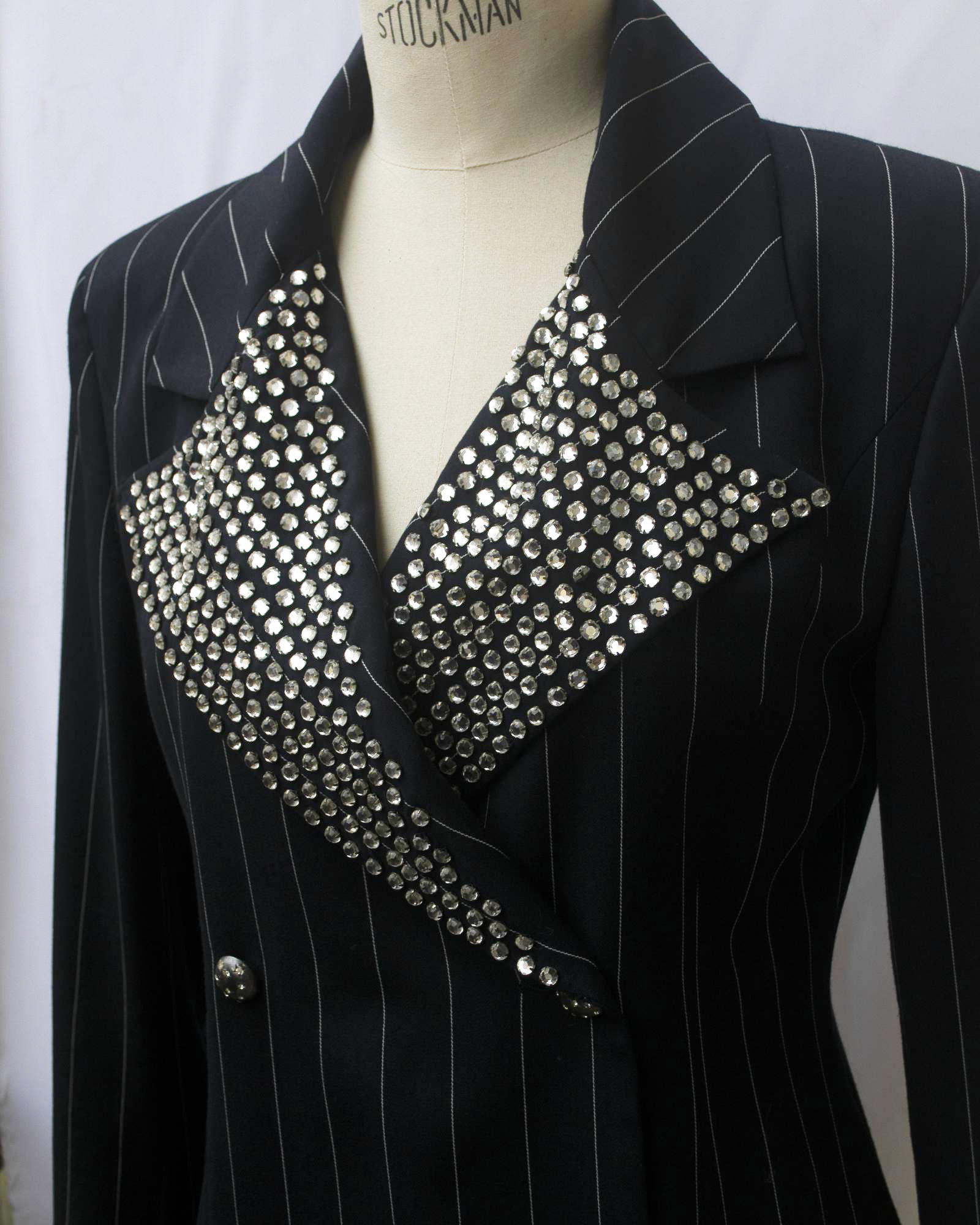 Giacca doppiopetto foderata in lana gessata. Revers completamente ricamati in swarovski. Prodotto in Italia negli anni '80. Bottoni gioiello. Taglia IT 42. Perfettamente conservata.