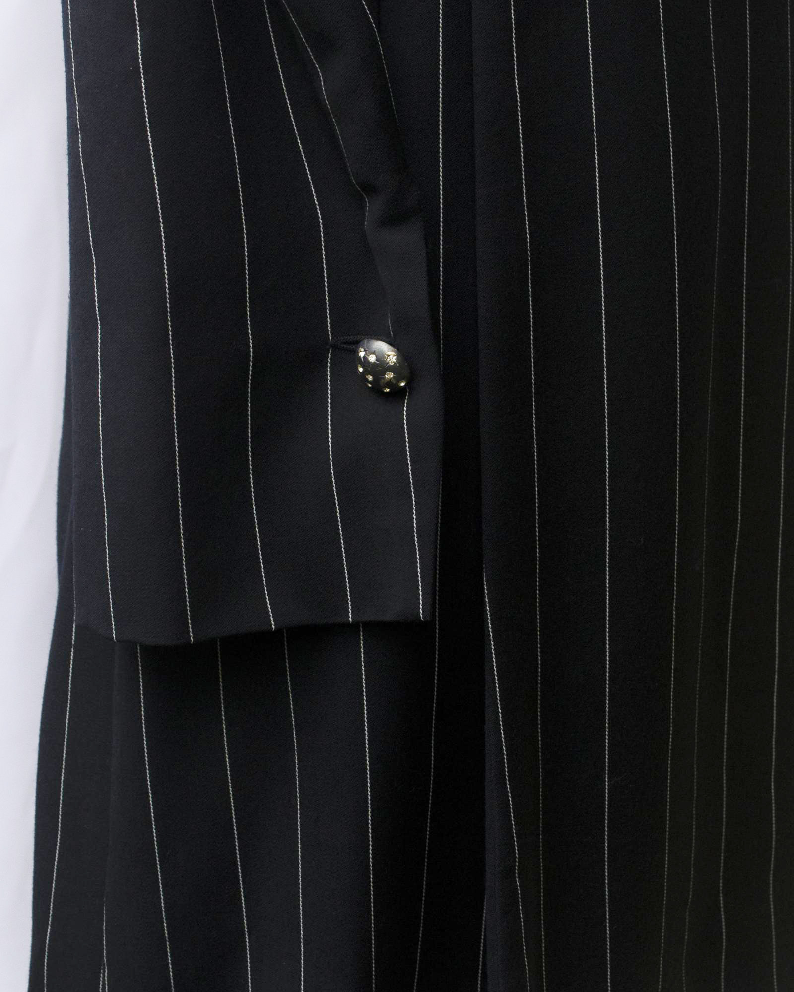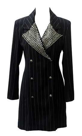 Lined double breasted jacket in pinstripe wool. Revers fully embroidered in swarovski. Made in Italy in the '80. Jewel buttons. Size IT 42. Perfectly preserved.