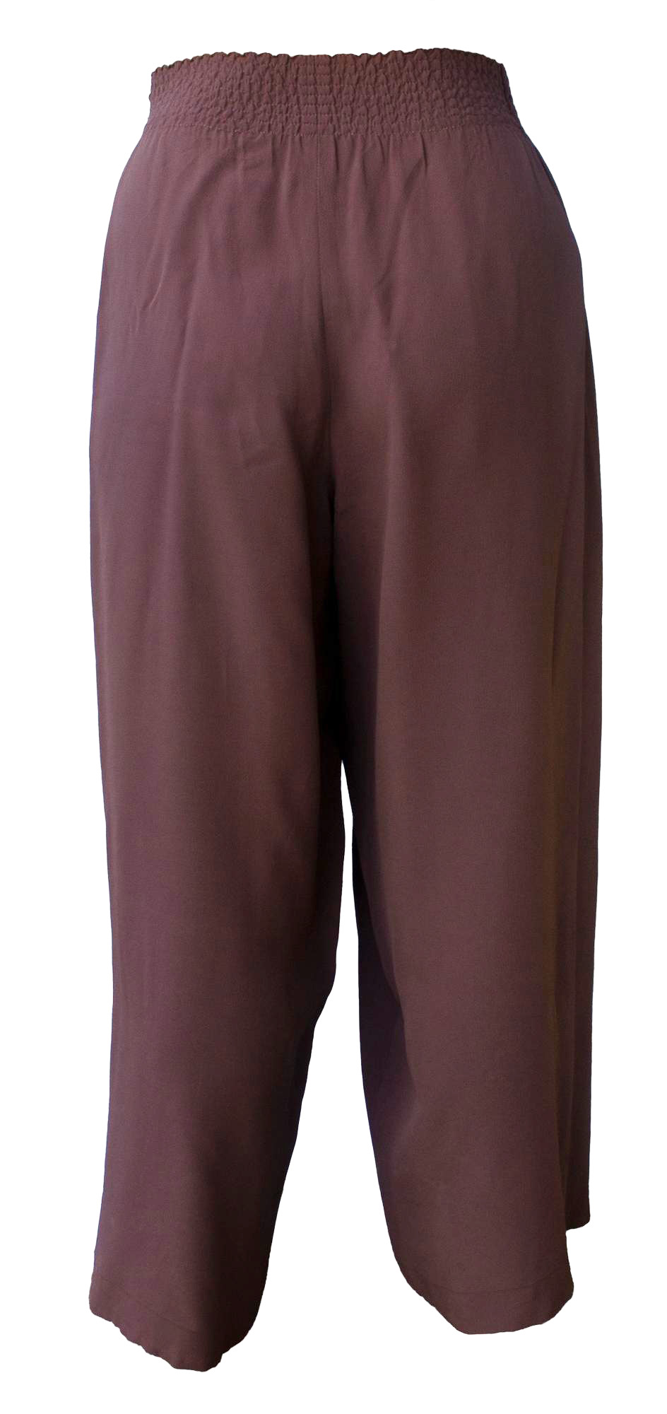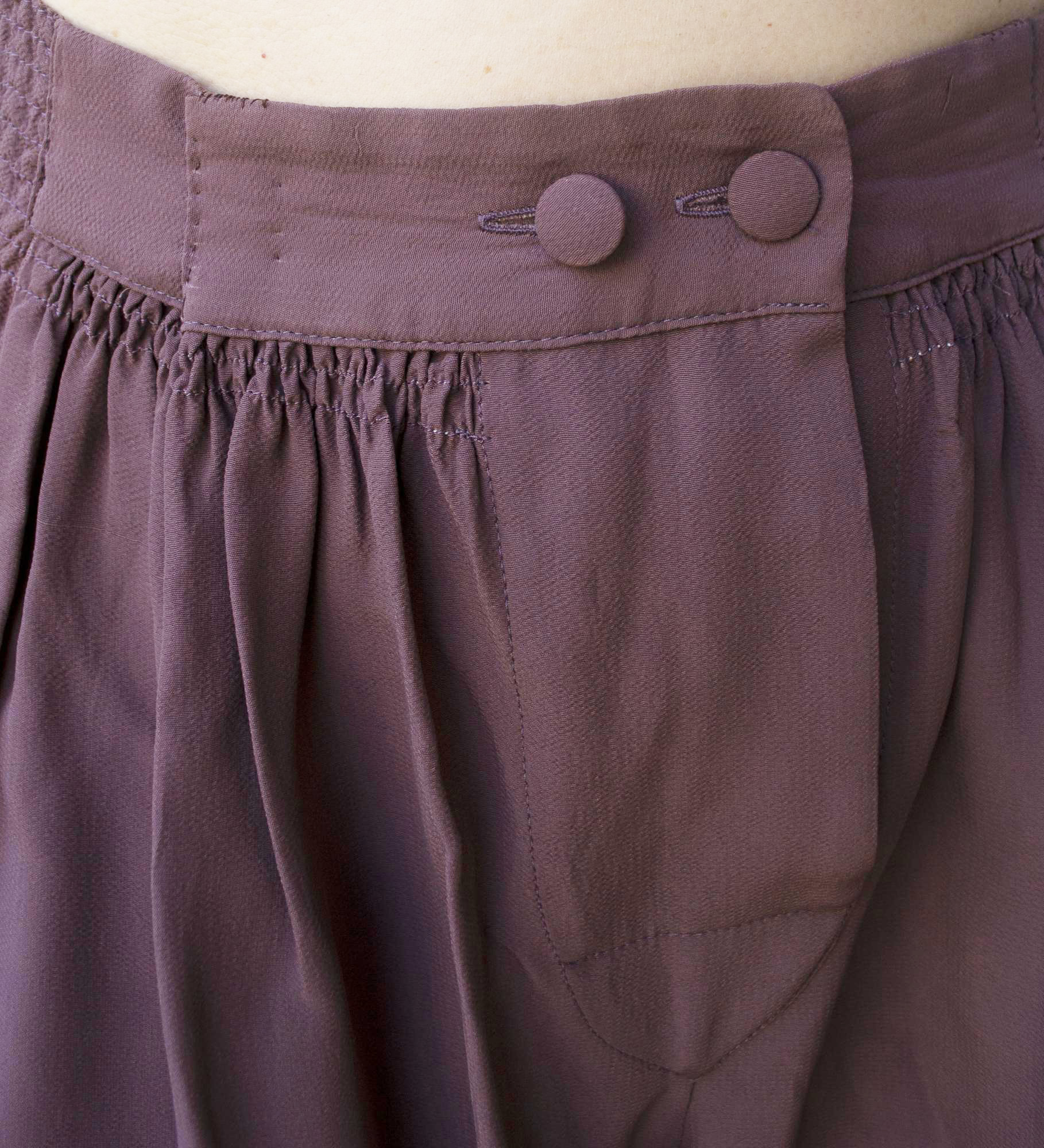 Crepe marocain malva per questo pantalone a gamba larga. Vita con ricamo in rilievo e apertura con due bottoni Made in Italy. Meta' degli anni '80. Taglia IT 42. Ben conservato.