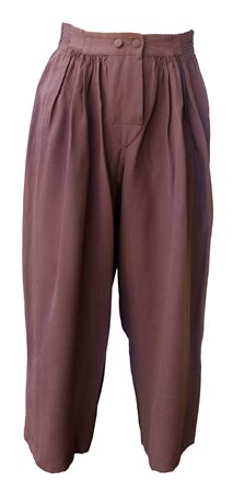 Mauve crepe marocain for this wide legs trouser. Waist embroiderd embossed and opening with two buttons. Made in Italy. Mid 80s. Size IT 42. Well Preserved.