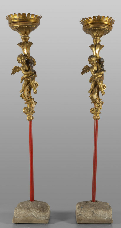 Coppia di grandi torcere in legno intagliato e dorato a motivi di angeli poggianti su basi antiche in pietra scolpita a motivi vegetali, Roma sec.XVII