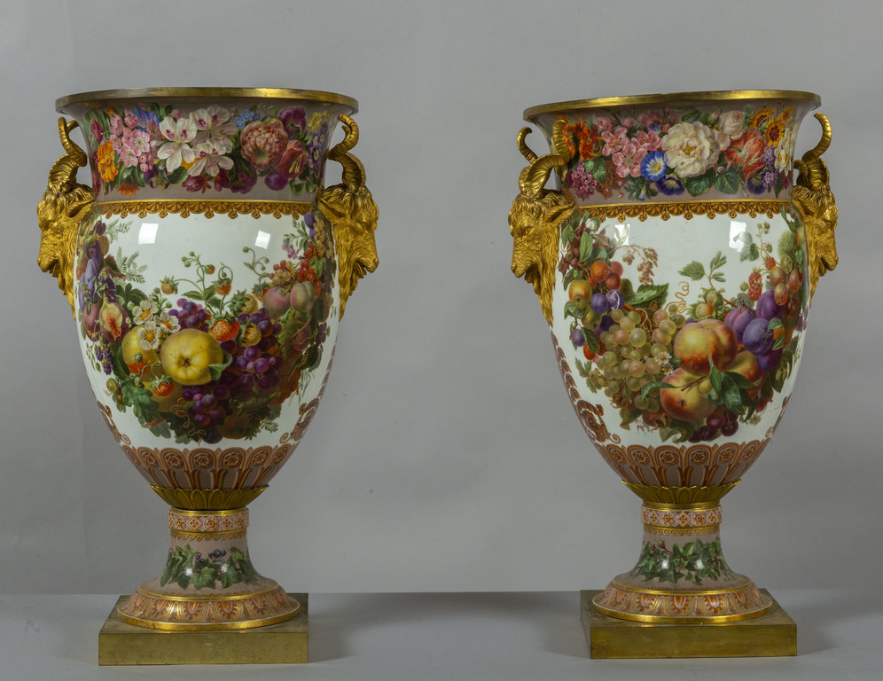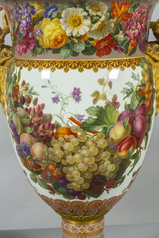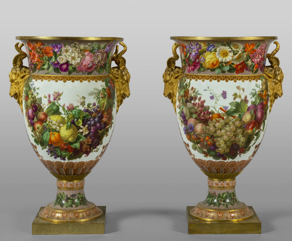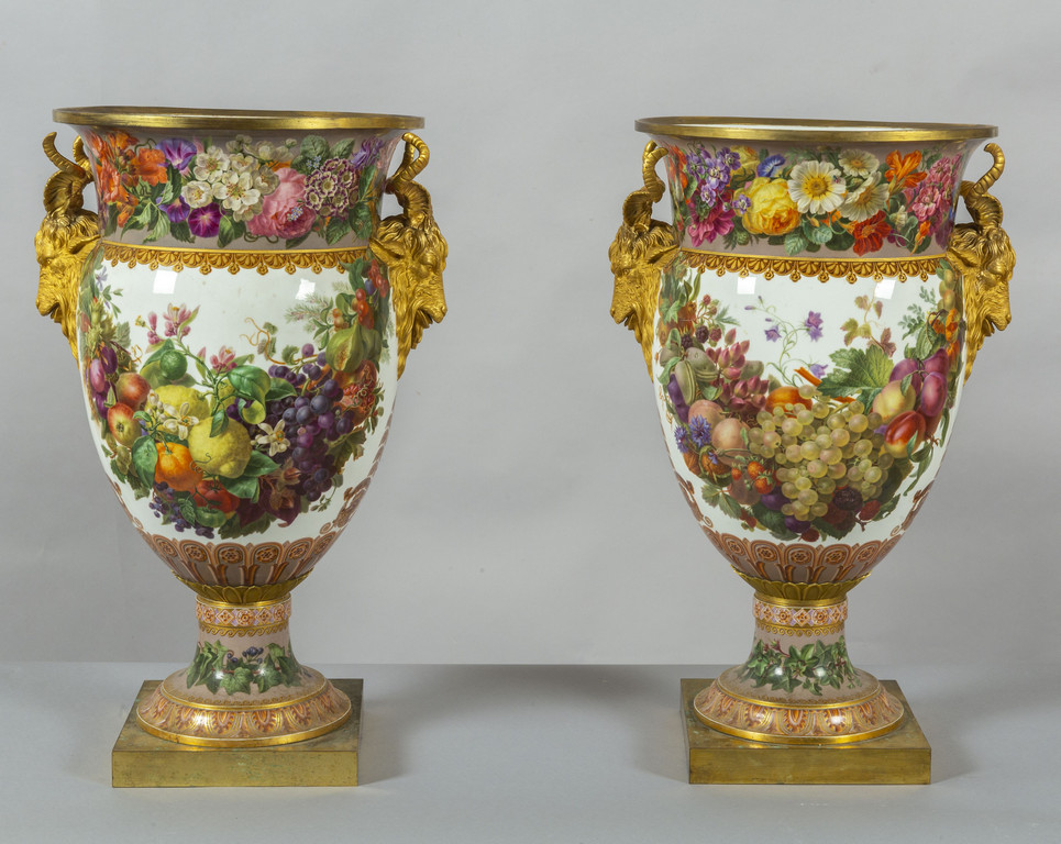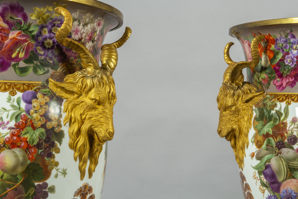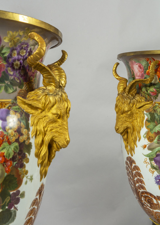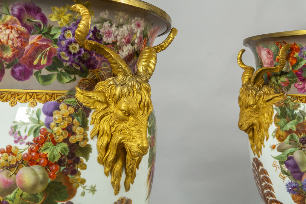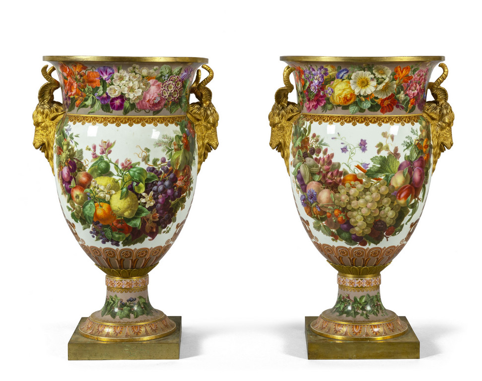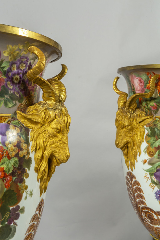 Importante coppia di vasi in porcellana decorata con smalti policromi ed oro lucido. Decorazione a tutto tondo su fondo bianco con grappoli d'uva e diverse varietà di fiori e frutta.
