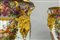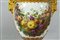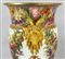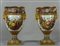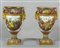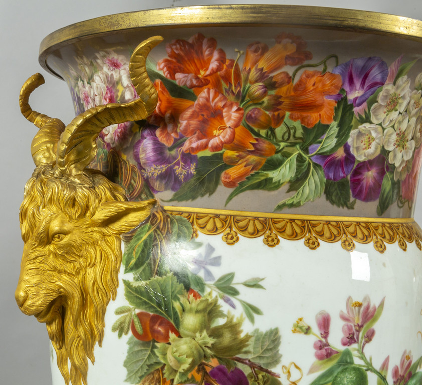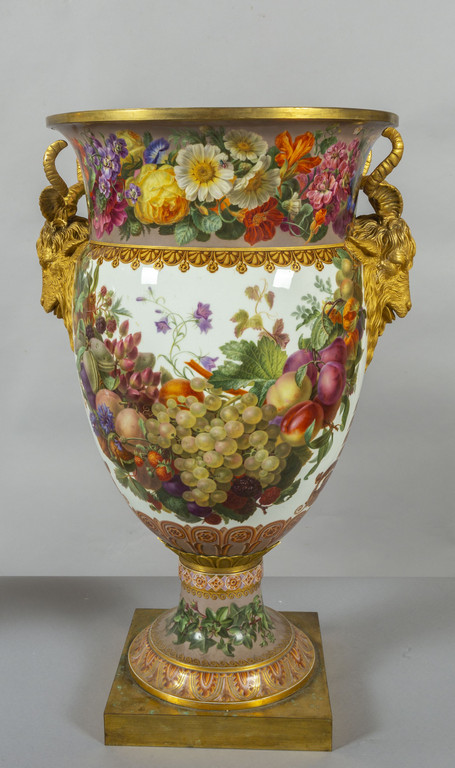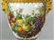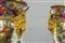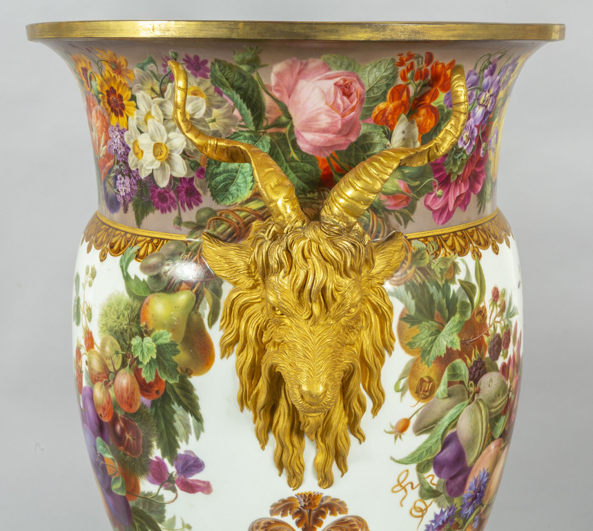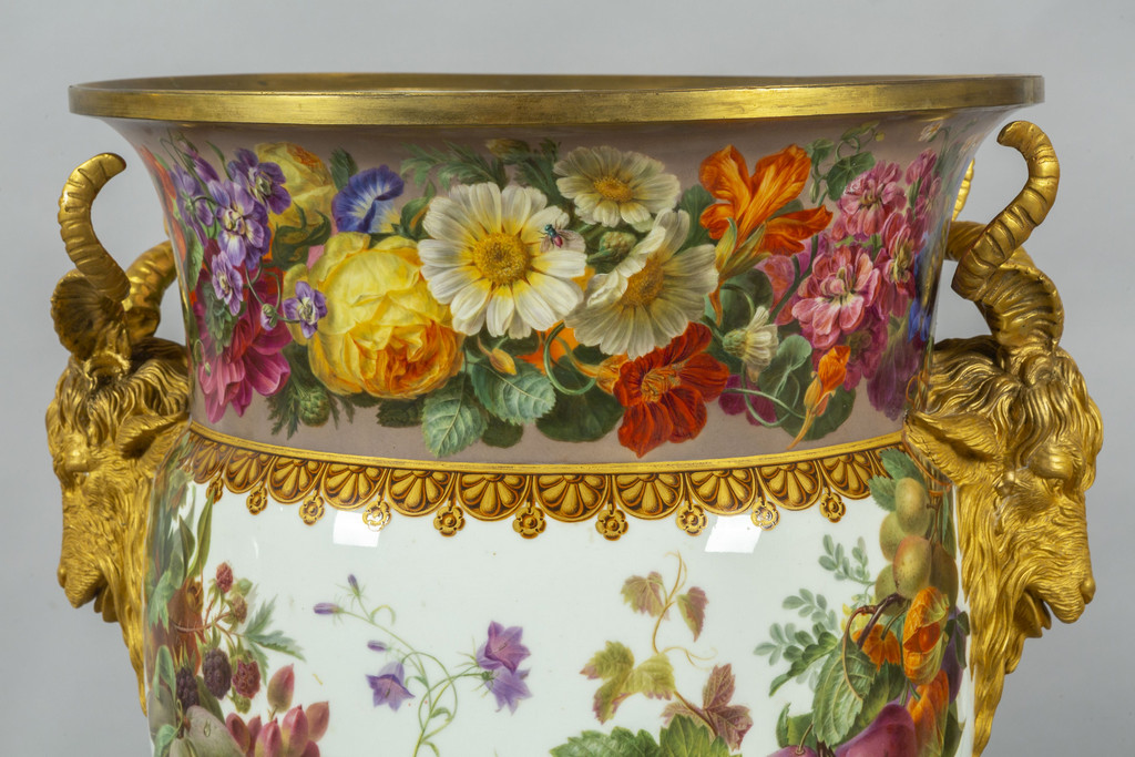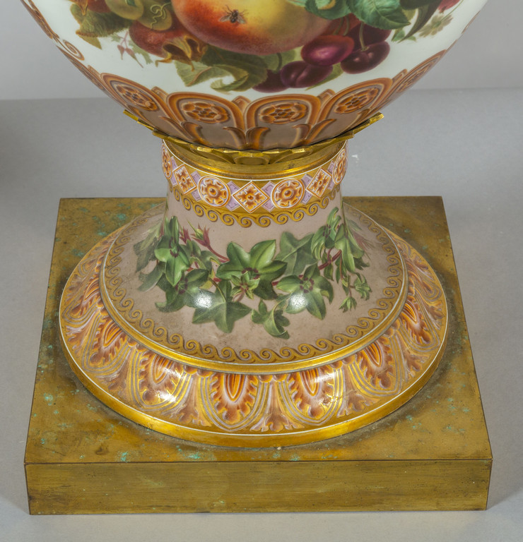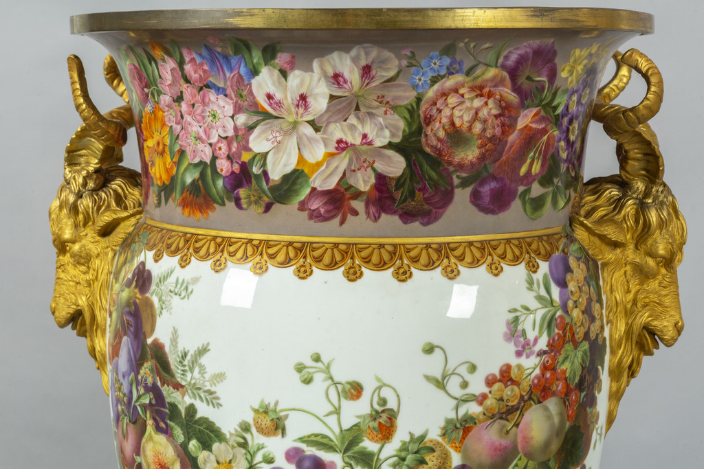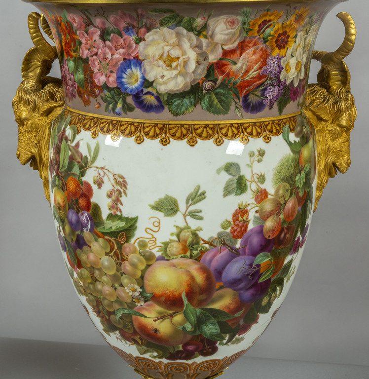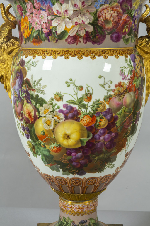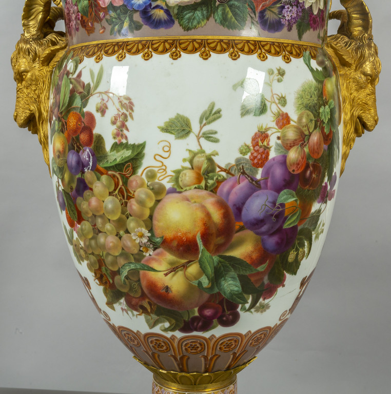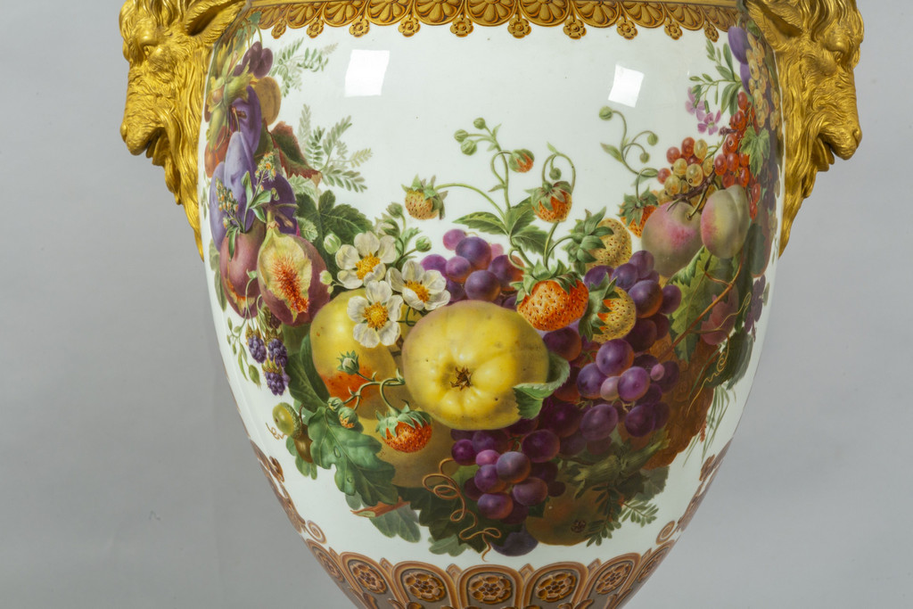 Importante coppia di vasi in porcellana decorata con smalti policromi ed oro lucido. Decorazione a tutto tondo su fondo bianco con grappoli d'uva e diverse varietà di fiori e frutta.