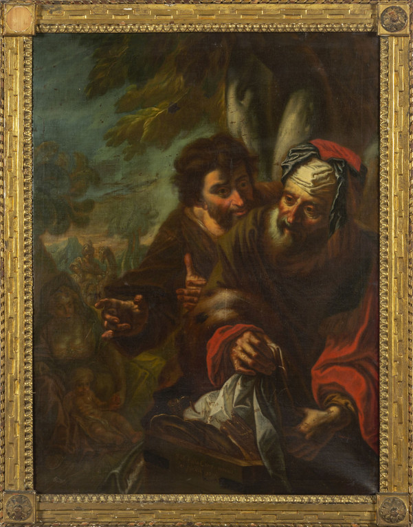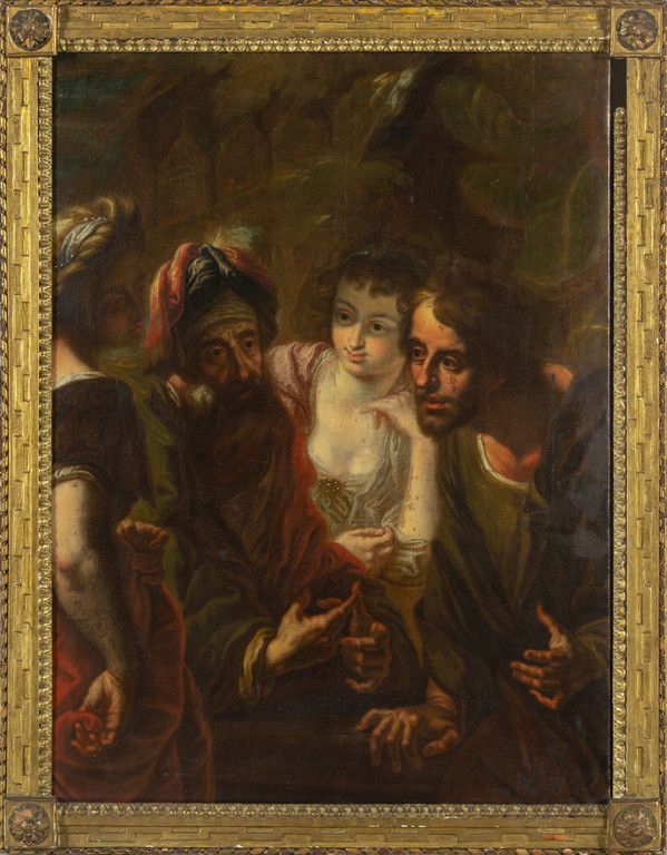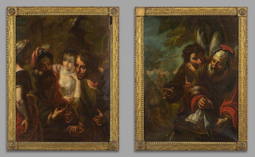 "Scene bibliche" coppia di olii, cornici coeve in legno intagliato e dorato, sec.XVIII