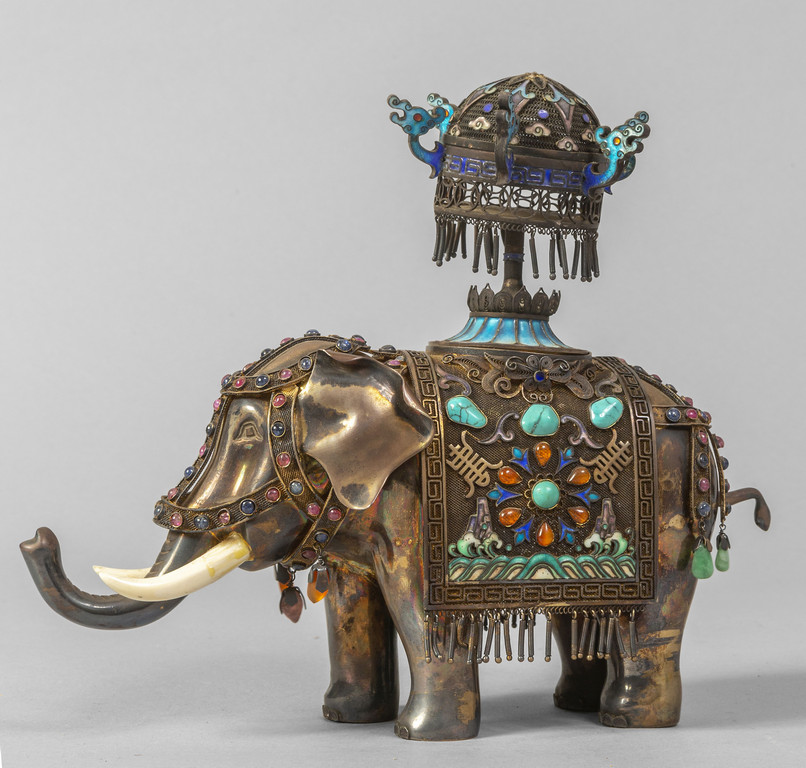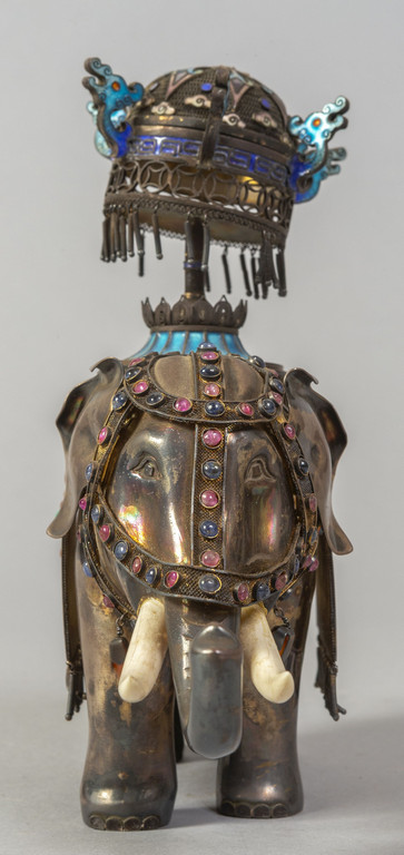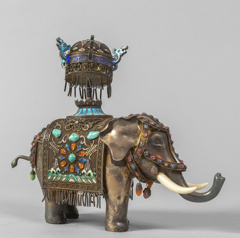 Elefante in argento portaprofumo con applicazioni di smalti e pietre dure, Cina sec.XIX