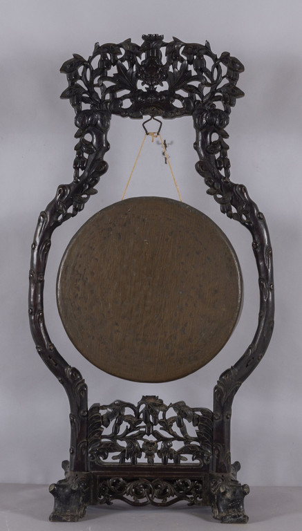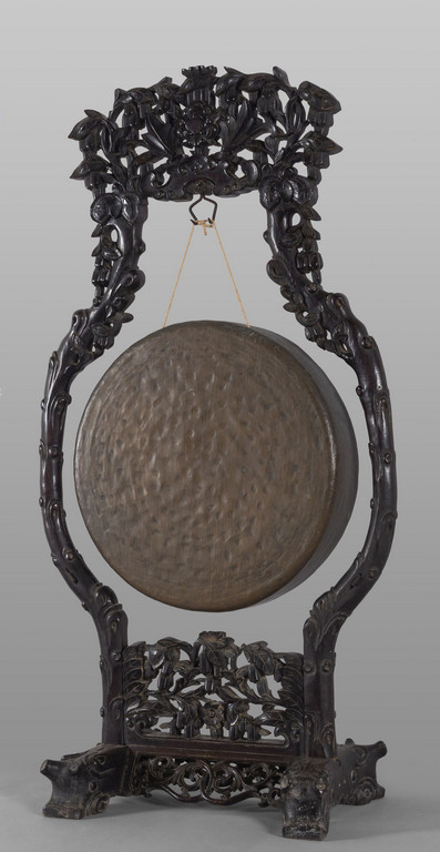 Gong in bronzo brunito con sostegno in legno intagliato, Cina sec.XIX