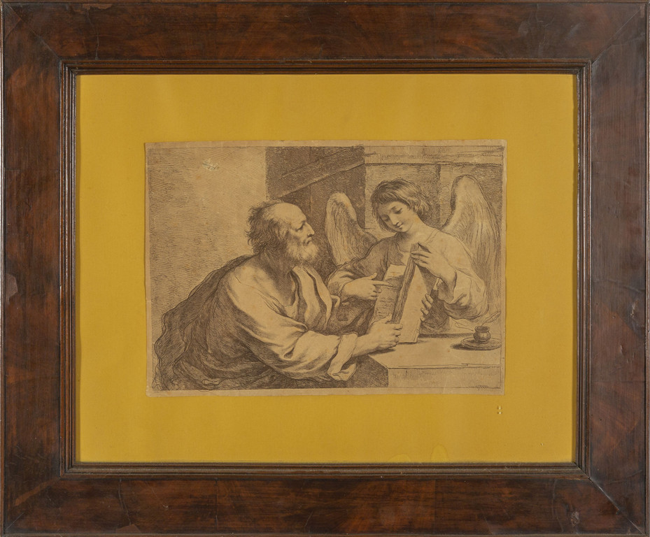 San Matteo e l'Angelo, stampa antica da disegno di Guercino
