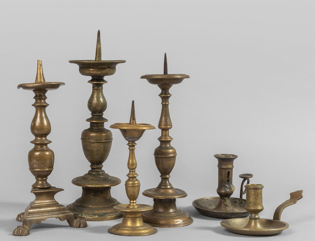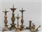 Quatttro candelieri in bronzo dorato e brunito sec.XVII/XVIII e due bugie in bronzo