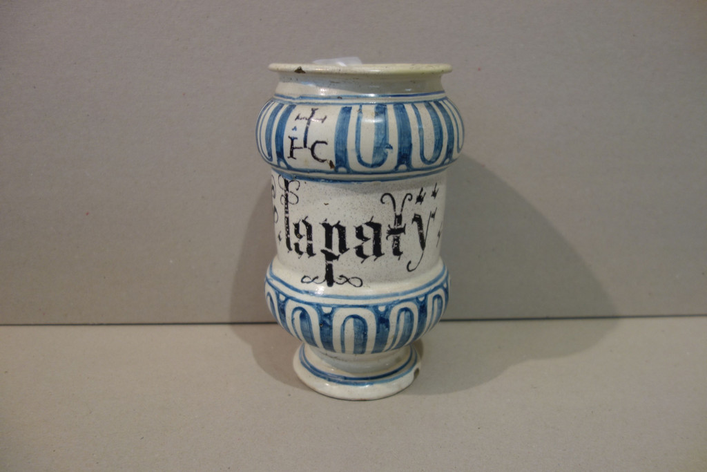 Albarello in ceramica bianca e blu con scritta medicinale, Veneto sec.XVIII