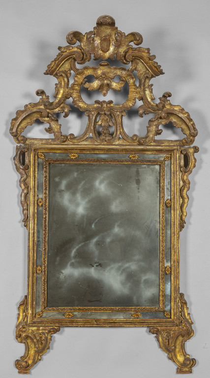 Specchiera Luigi XIV in legno intagliato e dorato a mecca con controspecchi, Piemonte metà sec.XVIII