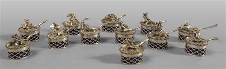 # Dodici salierine in argento con vetri blu e prese con fiorellini
