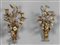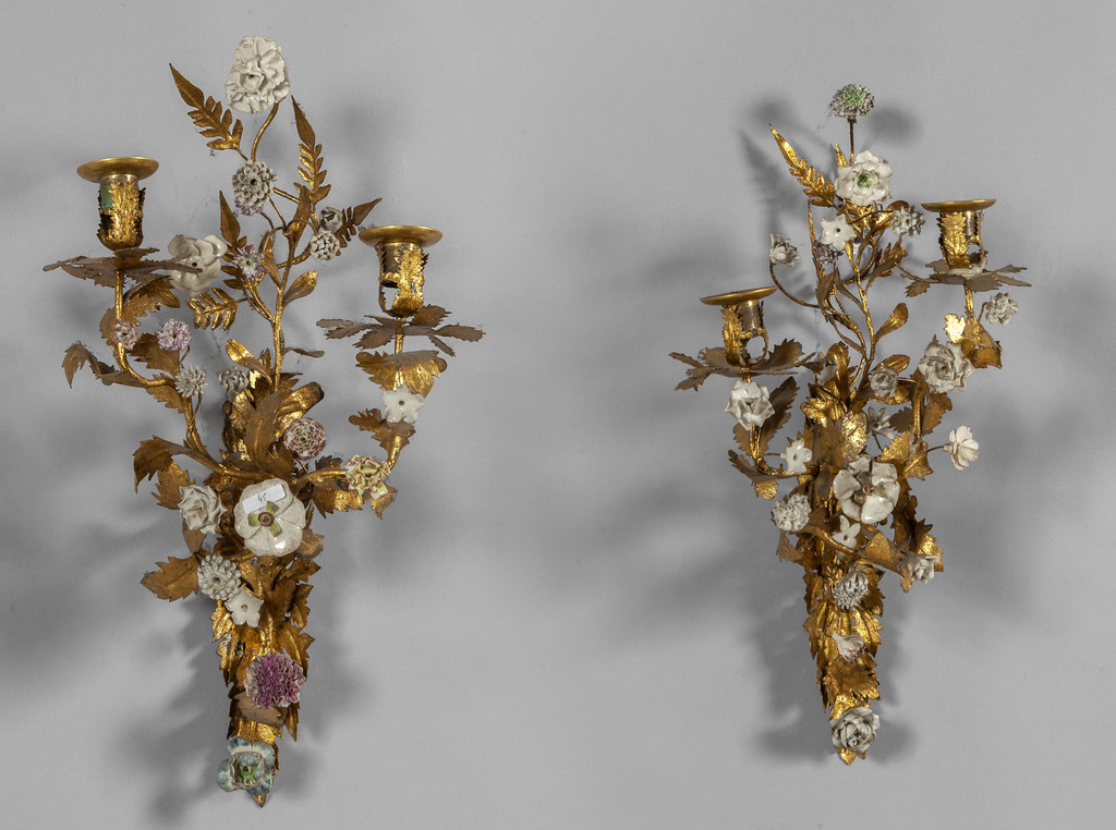 Coppia di apliques ad angolo a due luci in ferro dorato, applicazioni di fiori in porcellana, sec.XIX