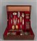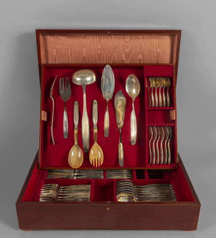 # Servizio di posate in argento composto da 6 cucchiaini grandi, 12 forchette e 12 coltelli grandi, 6 coltelli piccoli, 6 cucchiaini piccoli, 6 coltelli da pesce, 6 forchettine da dolce, 6 cucchiaini da dolce, 8 posate da portata, custodia originale in mogano, sec.XX