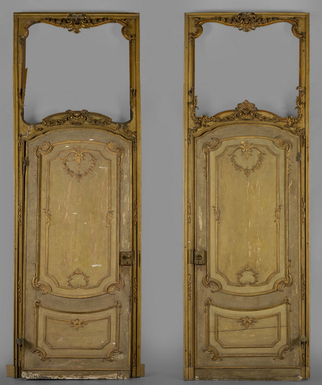 Coppia di importanti porte Luigi XV con chiambrane in legno intagliato dorato e laccato, Torino metà sec. XVIII (difetti e mancanze)