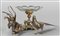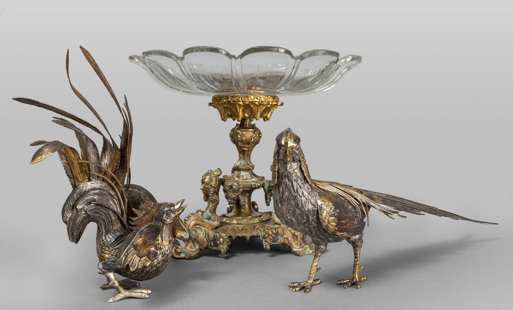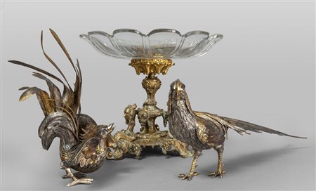 Alzata in bronzo dorato con coppa in cristallo, sec.XIX (diam.cm.28xh.25) e due fagiani in metallo argentato e dorato