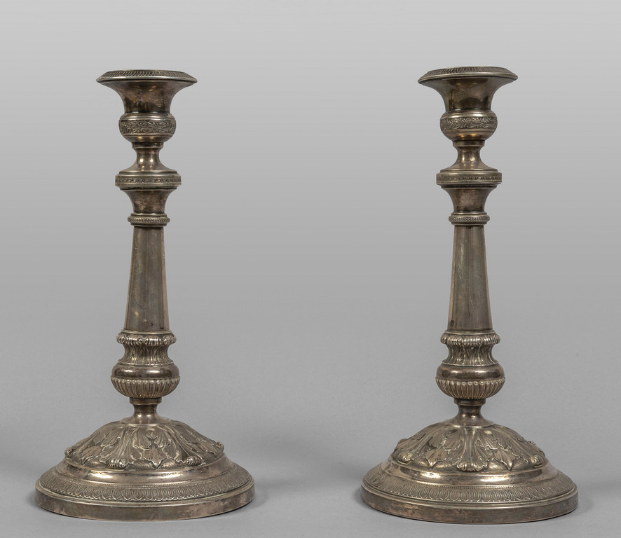 Coppia di candelieri Carlo X in argento, inizi sec.XIX