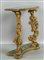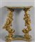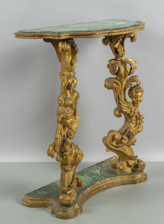 # Piccola console in legno intagliato, dorato e laccato formata da due fregi con testine di putti che sorreggono un pianetto