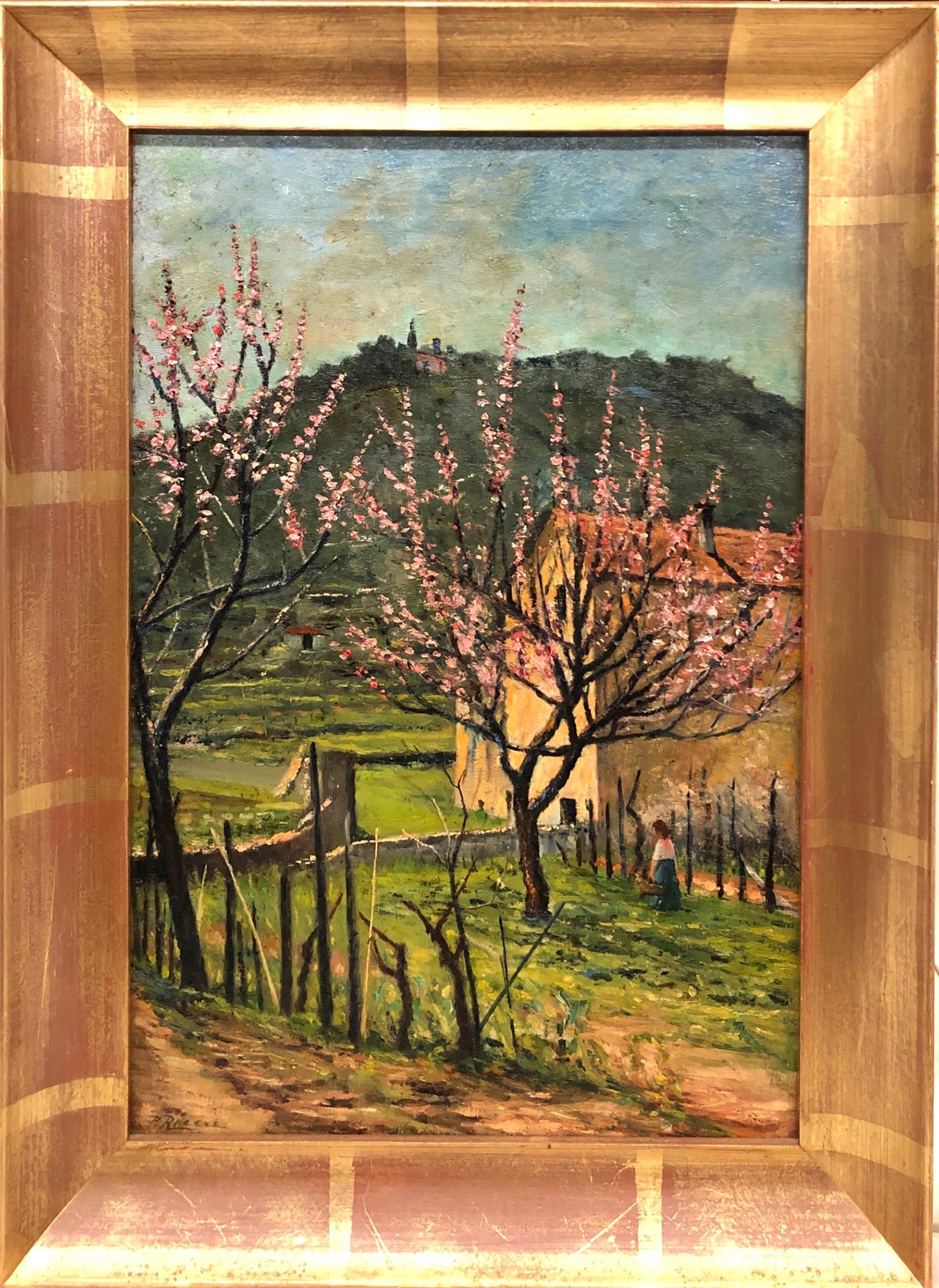 Ricca Pasquale 1854/1910 olio su tela raff.entroterra ligure con alberi in fiore, firmato in basso a sinistra