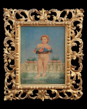 acquerello "amorino con cesto di fiori " in bella cornice in legno scolpito traforato e dorato sec XIX .Misure con cornice 30x26 cm