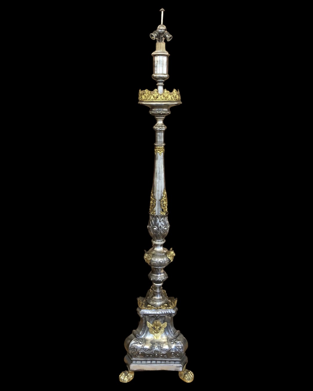 Grande candeliere in metallo argentato con applicazioni in bronzo dorato