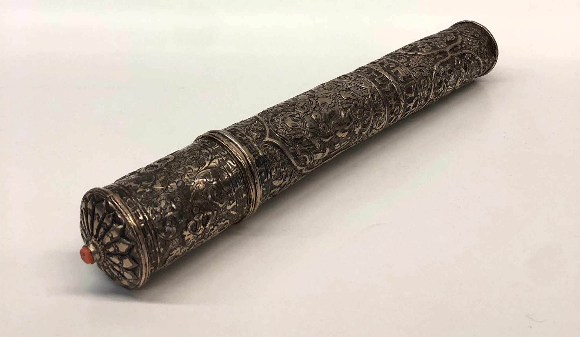 Tibet, portadocumenti in argento cesellato con incastonato corallo gr.254