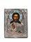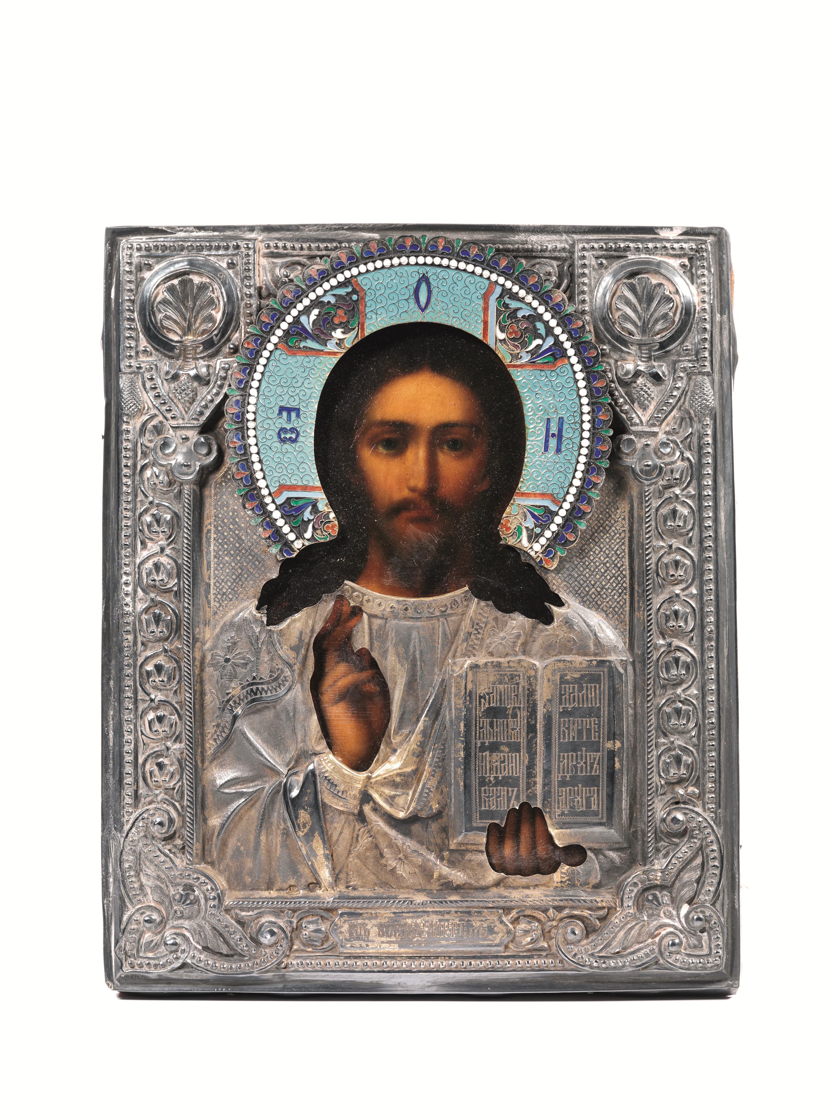 Icona moscovita raffigurante Cristo benedicente, riza in argento con smalti...