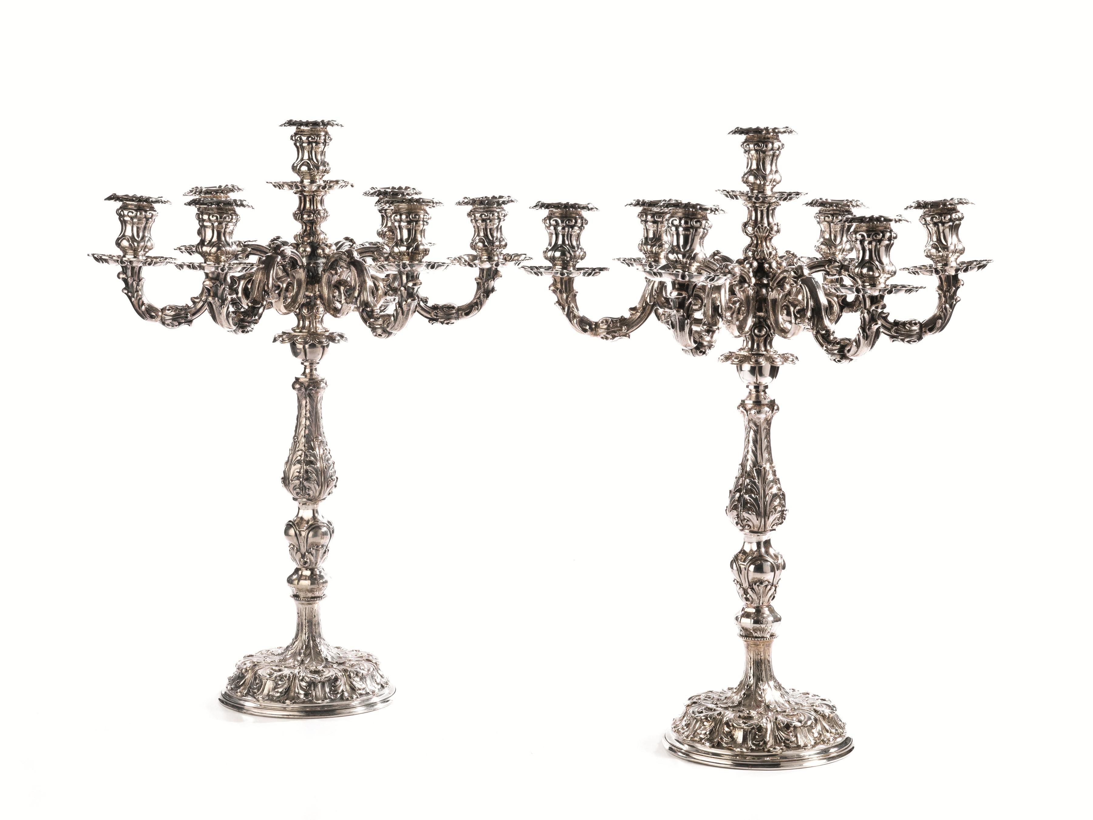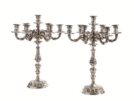Coppia di candelabri, Fratelli Genazzi, sec. XX in argento, base circolare bombata e fusto a balaustro cesellati e sbalzati a foglie, cinque bracci ricurvi, complessive sei luci, alt. cm 60, g 6500 (2)