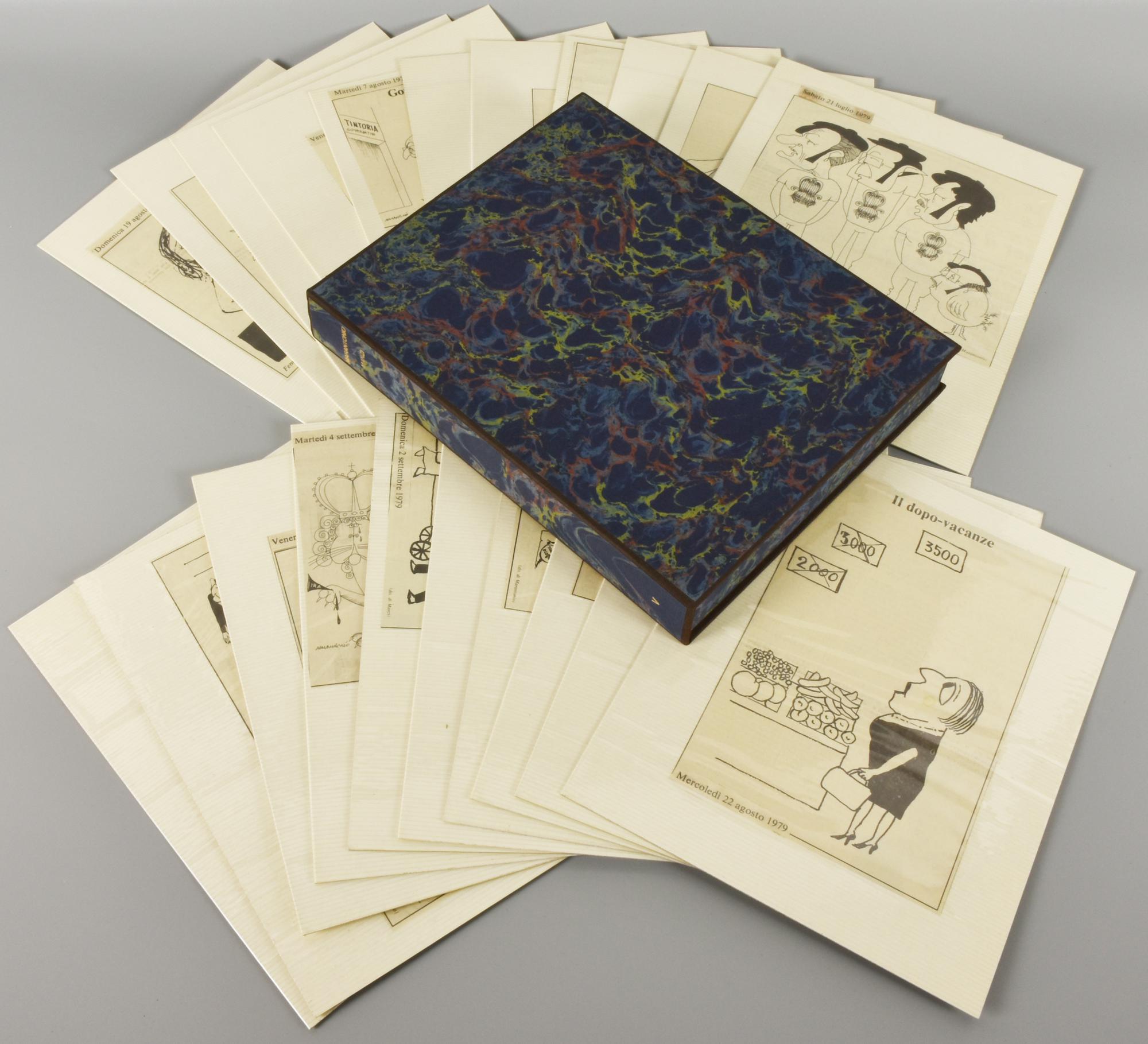 cofanetto di vignette satiriche ritagliate da "Il giornale" e incollate su 21 cartoncini, cofanetto cm 27x21,5x4, cartoncini cm 25x20