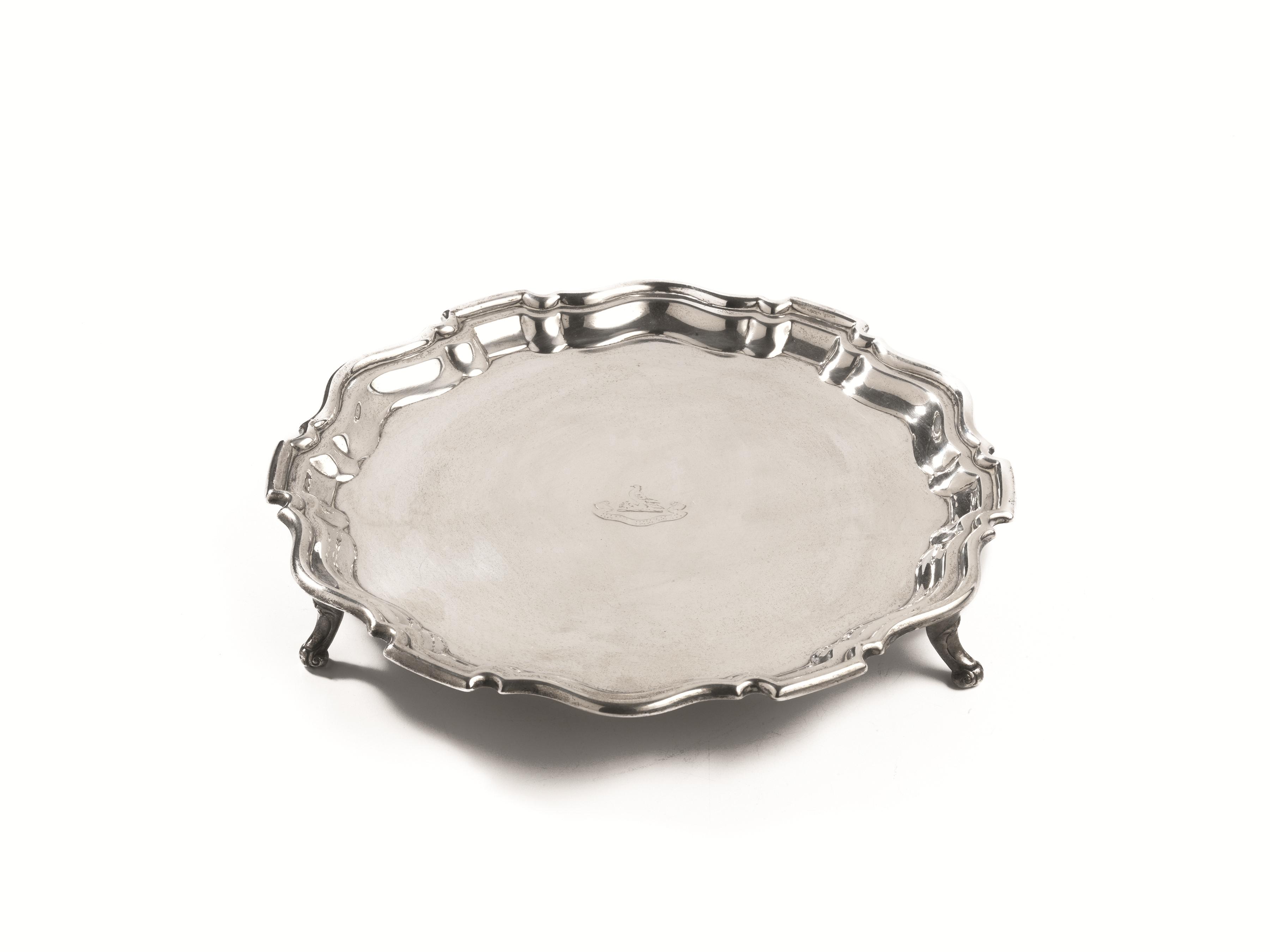 Salver, Città di Sheffield, sec. XX, in argento, bordo sagomato, poggiante su tre piedini a voluta, diam. cm 24,5, g 540