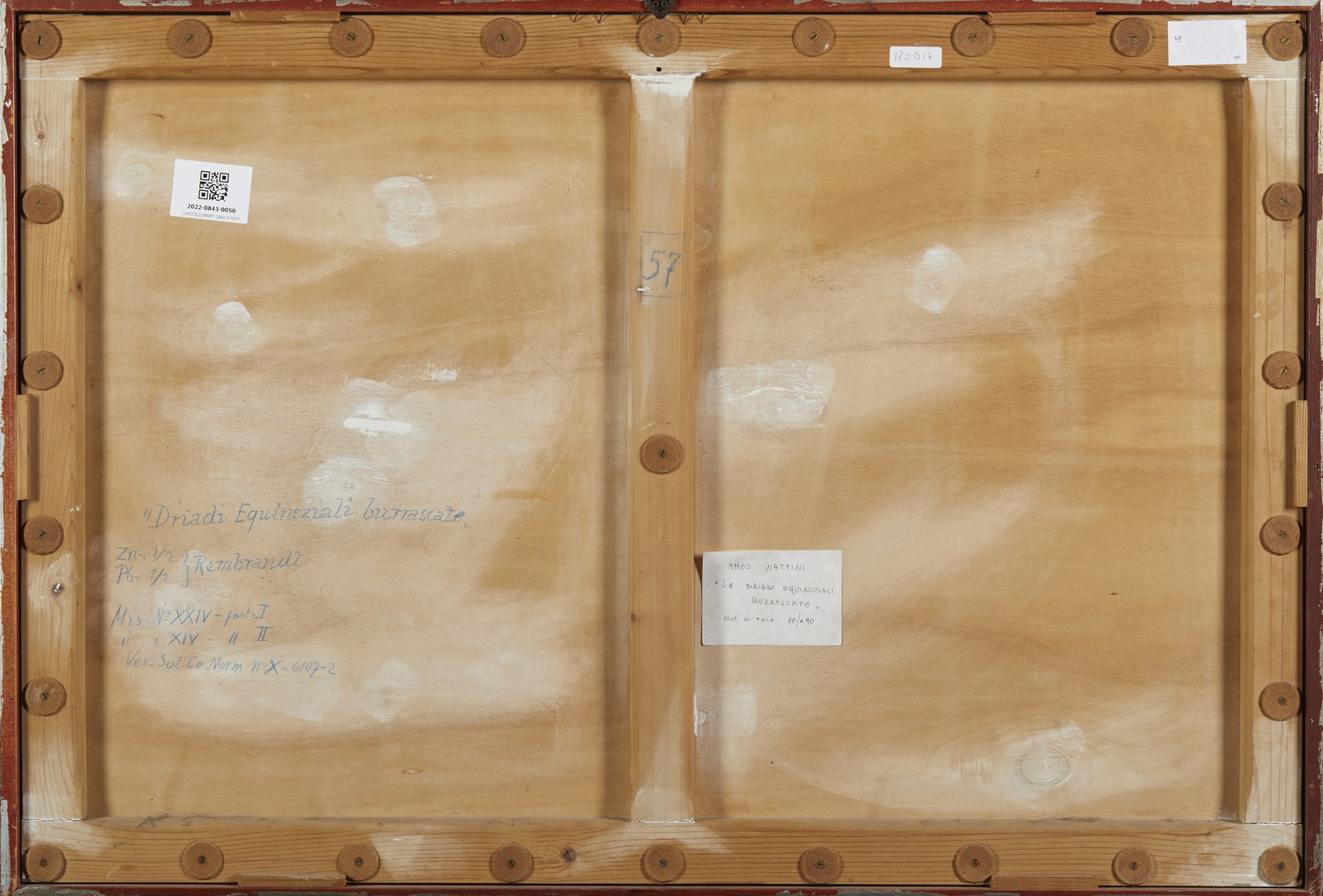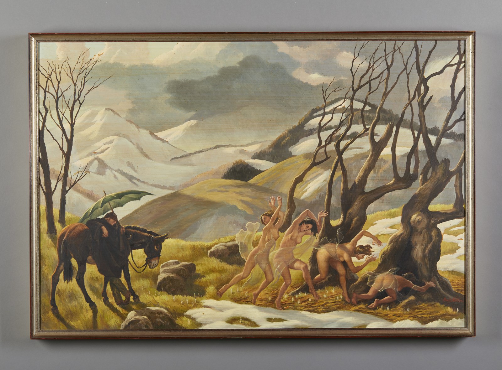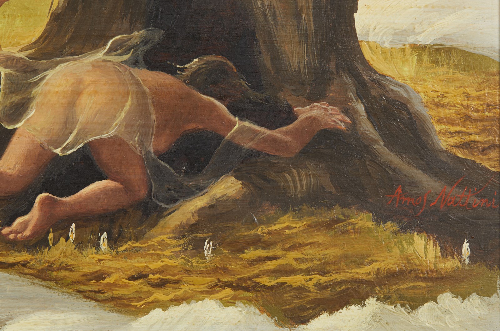 NATTINI AMOS (1892 - 1985) Le driadi equinoziali burrascate. Olio su tavola. Cm 87,00 x 59,00. Firma in basso a destra. Titolo al retro. Cornice presente