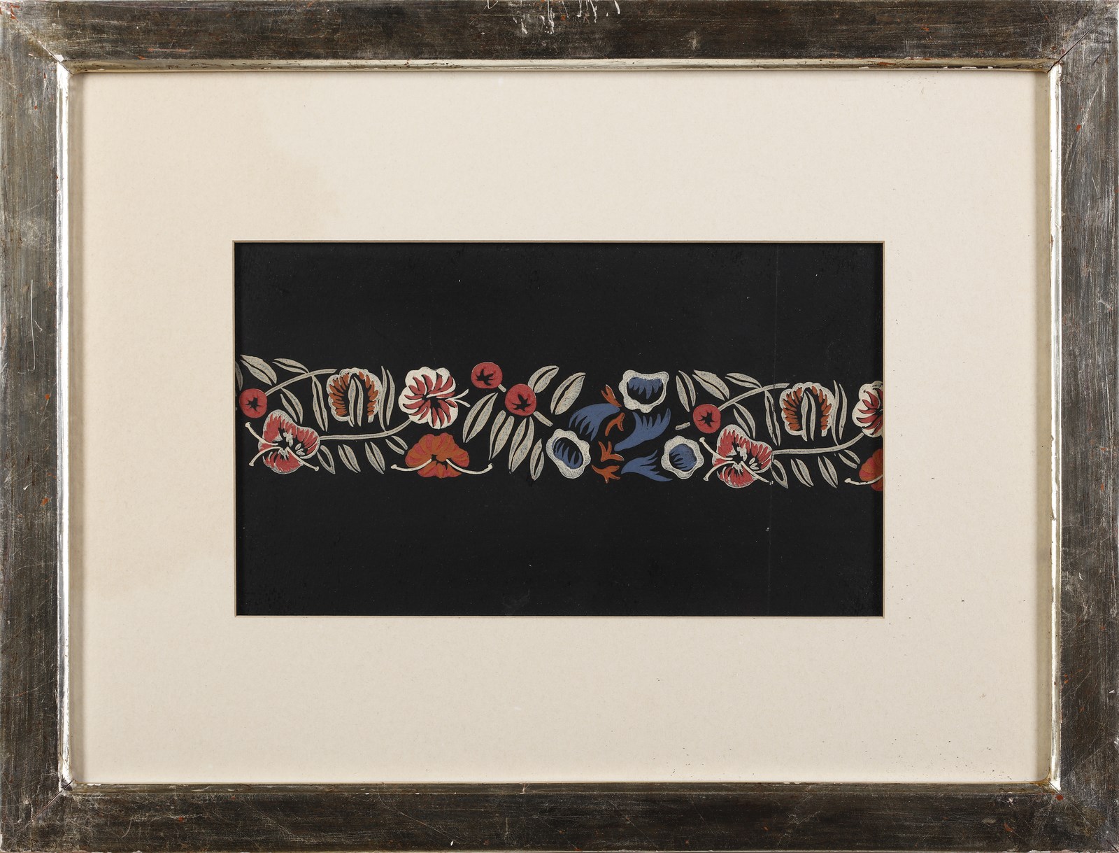 DUFY RAOUL (1877 - 1953) Senza titolo. Gouache. Cm 29,50 x 18,00. Firma al retro. Stampatore: maison Bianchini-Férier, Lione.L'opera verrà inserita nel Catalogue raisonné des projets de tissus de Raoul Dufy, Paris, attualmente in preparazione a cura di Fanny Guillon - Laffaille. Dichiarazione di autenticità Fanny Guillon Lafaille riportante il relativo numero d'inventario. Cornice presente