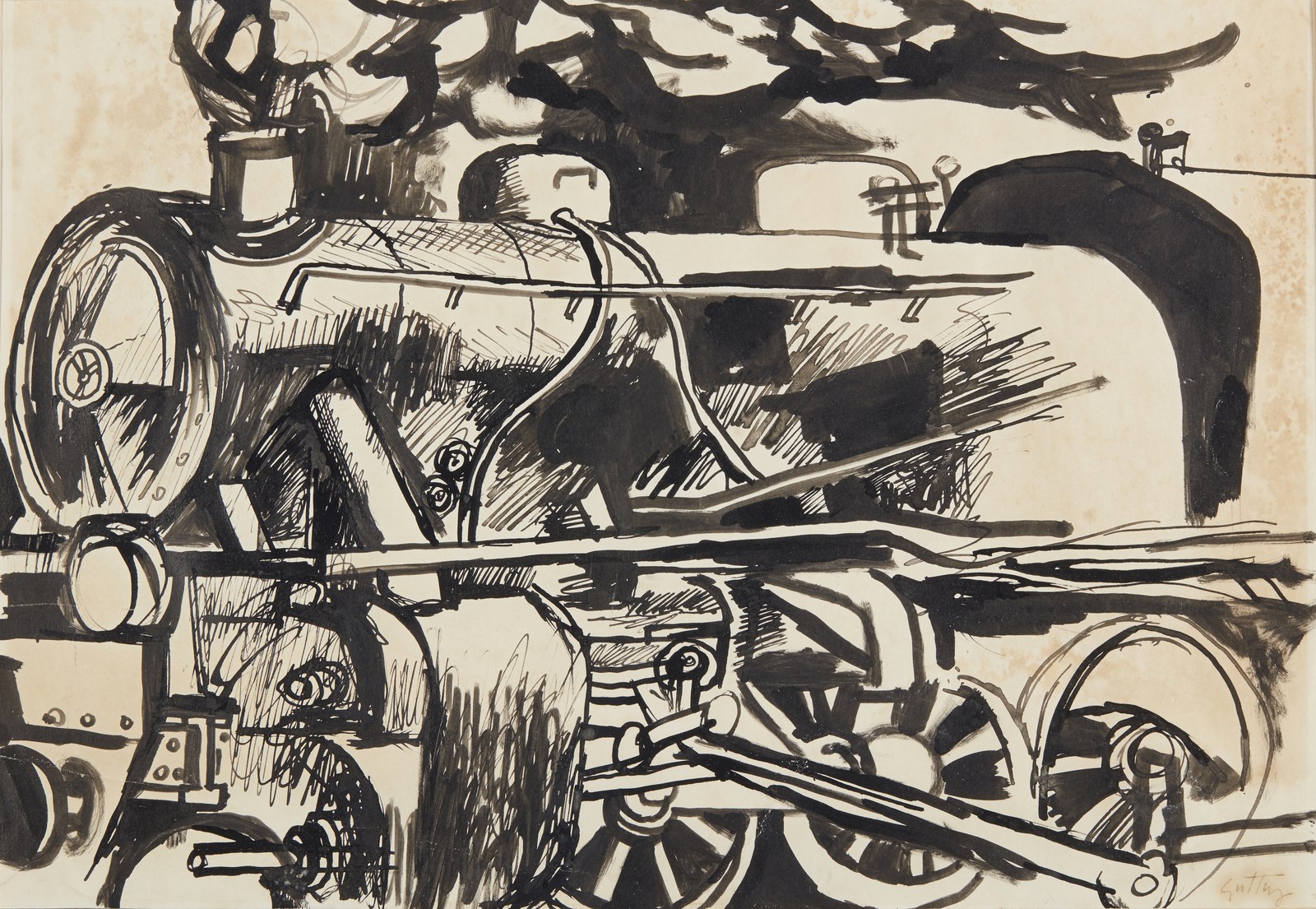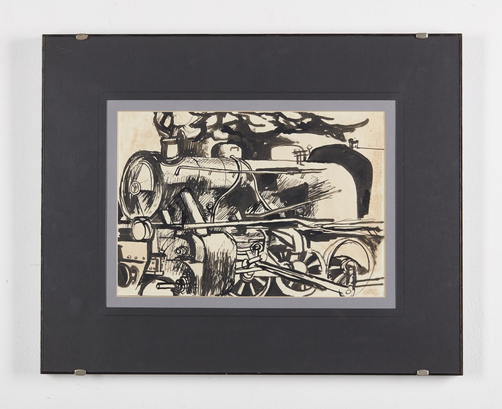GUTTUSO RENATO (1912 - 1987) La locomotiva. Tecnica mista su carta. Cm 36,00 x 25,00. Firma in basso a destra. Opera archiviata presso Gli Archivi Renato Guttuso, Roma, come da documentazione fotografica allegata all'opera riportante il relativo numero d'inventario. Anni'50. Difetti.