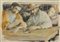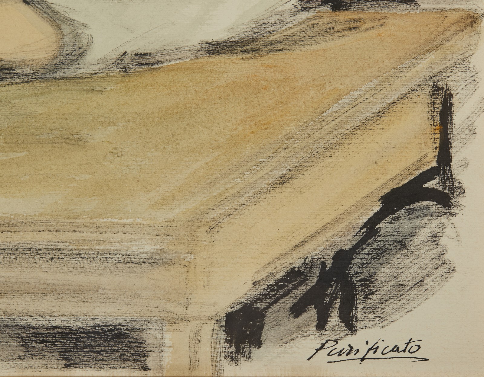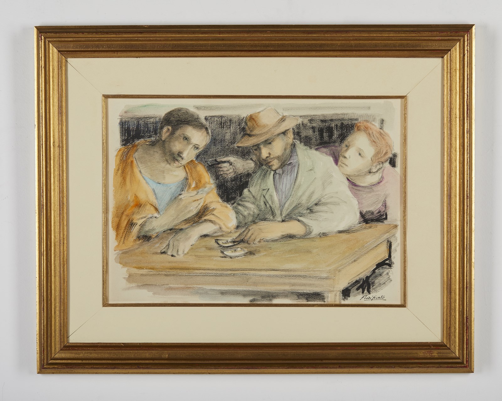 PURIFICATO DOMENICO (1915 - 1984) I tre giocatori. 1979. Tecnica mista su carta. Cm 50,00 x 35,00. Firma in basso a destra. Cartiglio dell'Associazione Italiana Pittori cattolici, Mestre. Cornice presente