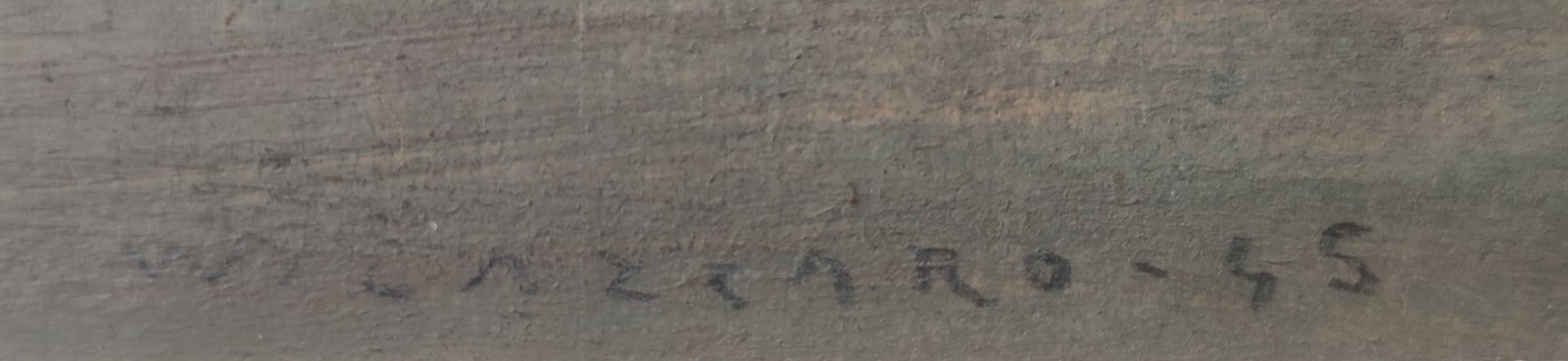 LAZZARO WALTER (1914 - 1989) Silente laguna. 1945. Olio su carta su compensato. Cm 49,00 x 32,00. Firma e anno in basso a destra. Autentica su fotografia di Sandra Lazzaro riportante il relativo numero d'inventario (tecnica errata)