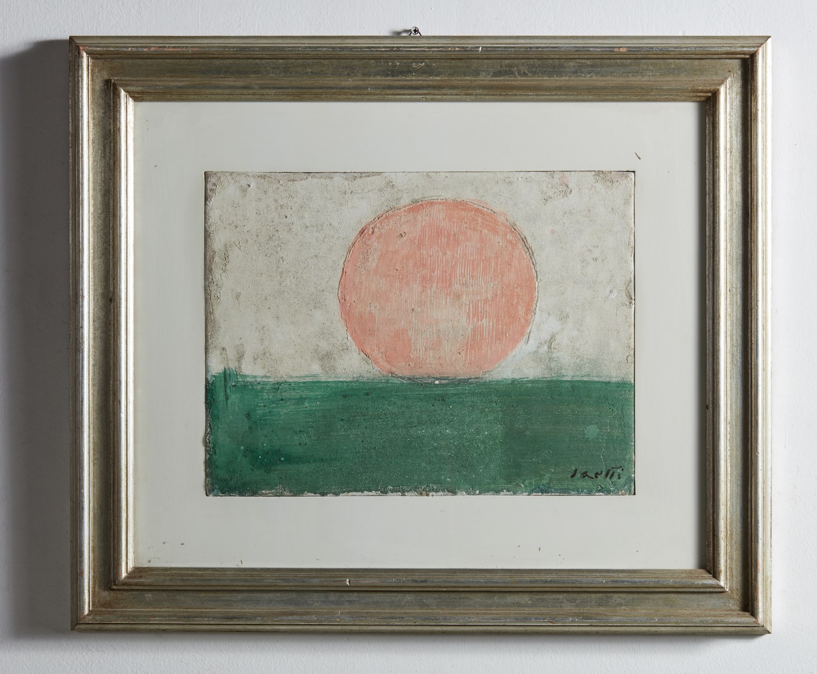 SAETTI BRUNO (1902 - 1984) Paesaggio con sole (bozzetto). Affresco su tela. Cm 41,00 x 31,00. Firma in basso a destra e al retro. Opera archiviata presso l'Archivio Storico Artisti Veneti, Mestre, come da documentazione fotografica allegata all'opera riportante il relativo numero d'inventario. Anni'70. Cornice presente