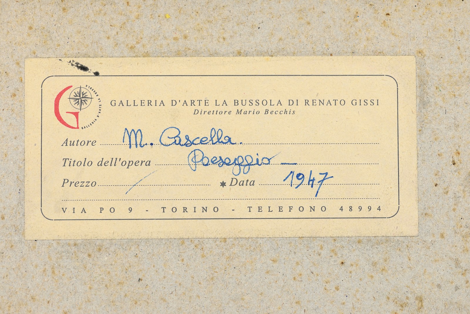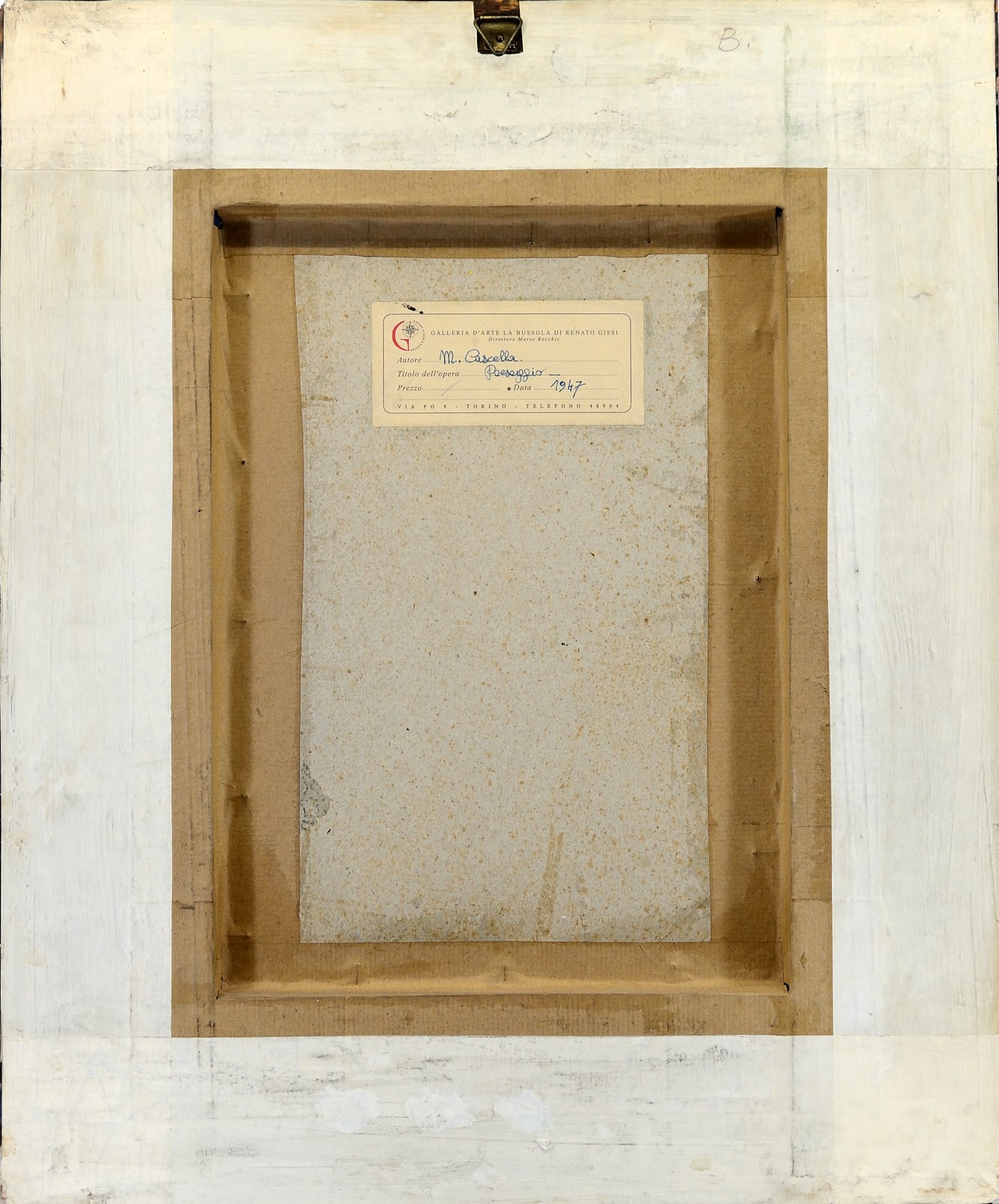 CASCELLA MICHELE (1892 - 1989) Paesaggio. 1947. Olio su cartone. Cm 19,00 x 25,00. Firma in basso a destra. Al retro cartiglio Galleria La Bussola, Renato Gissi, Torino. Lievi difetti. . Cornice presente