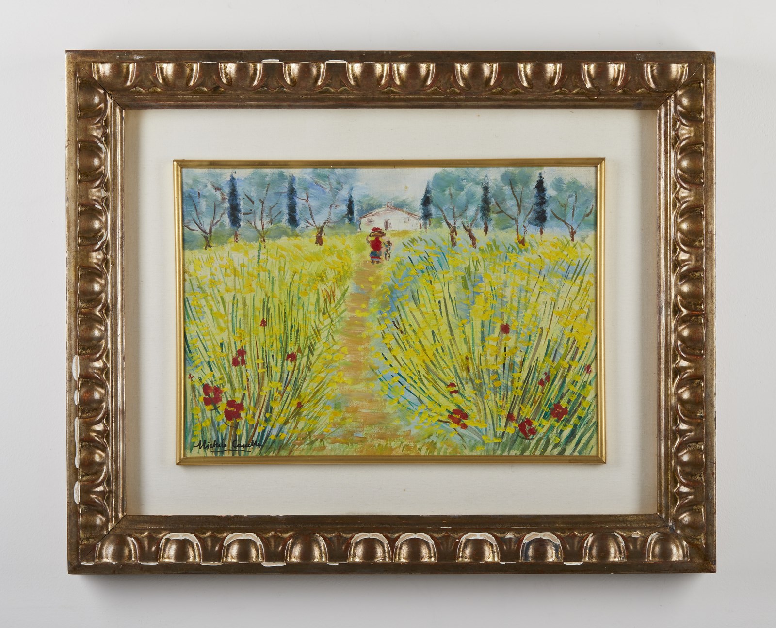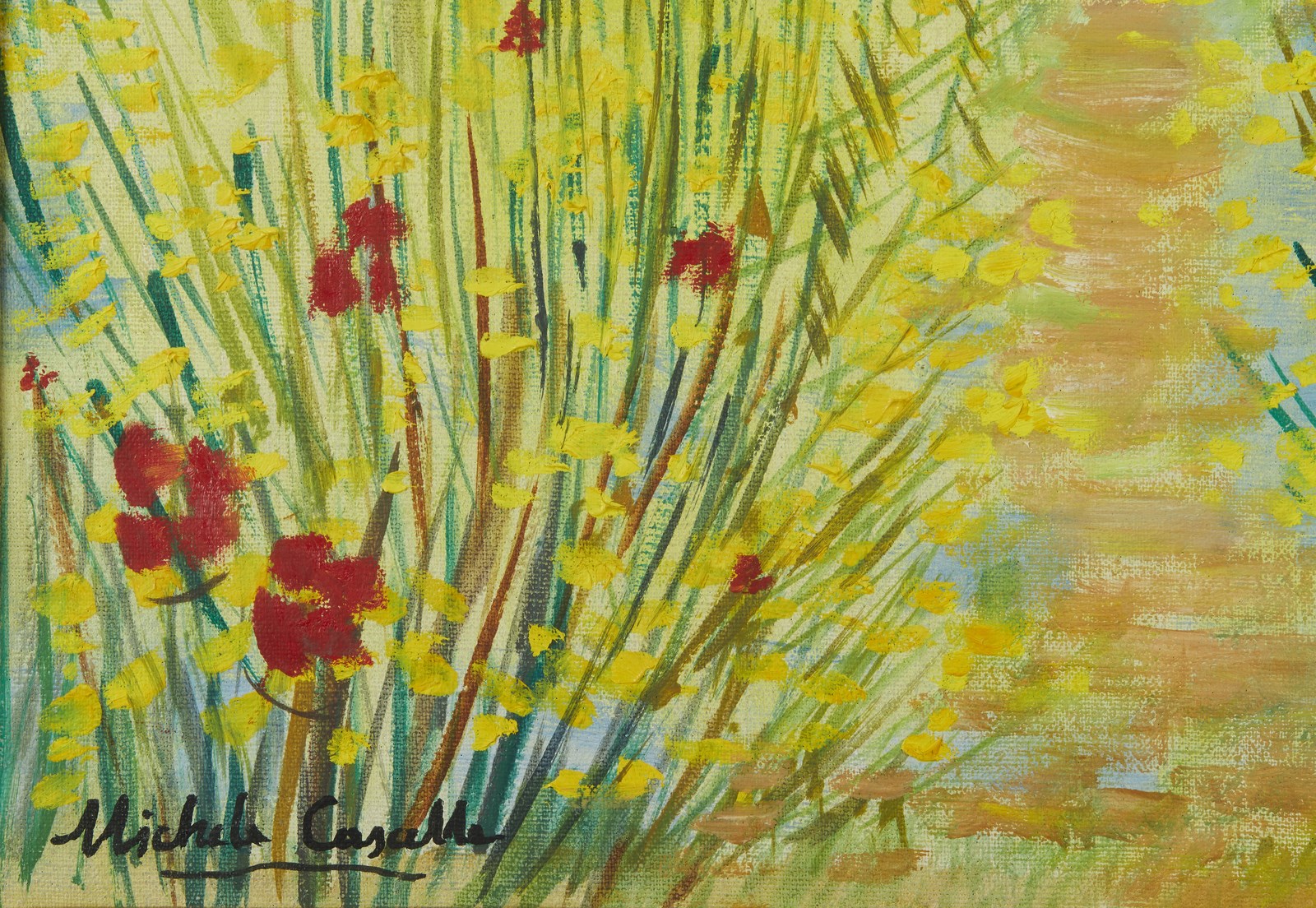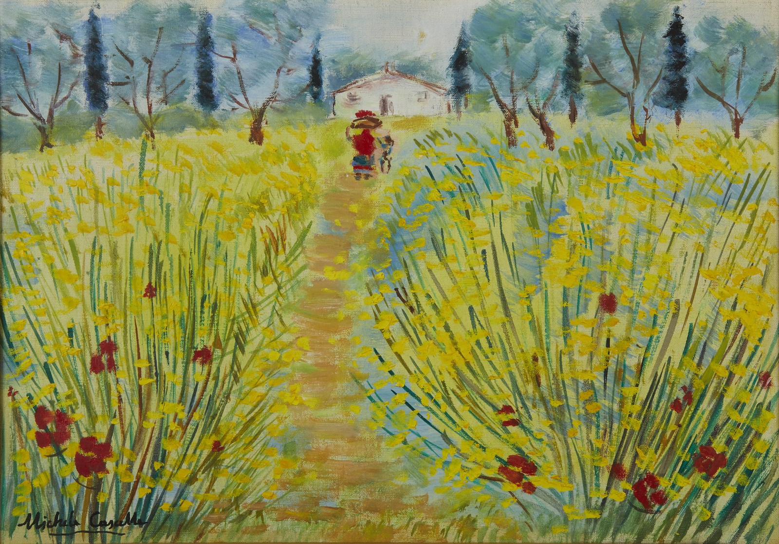 CASCELLA MICHELE (1892 - 1989) Sentiero tra le ginestre. 1980. Olio su tela . Cm 50,00 x 35,00. Firma in basso a sinistra e al retro. Autentica dell'artista su fotografia con timbro a secco Meeting Art, Vercelli. Cornice presente