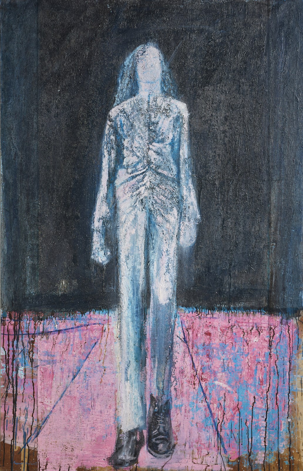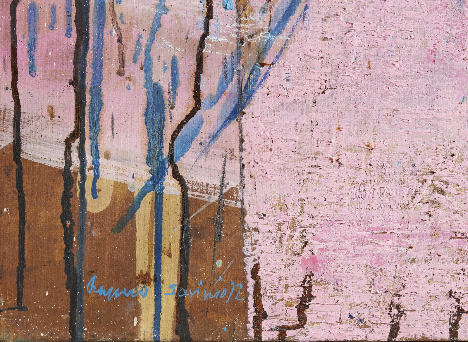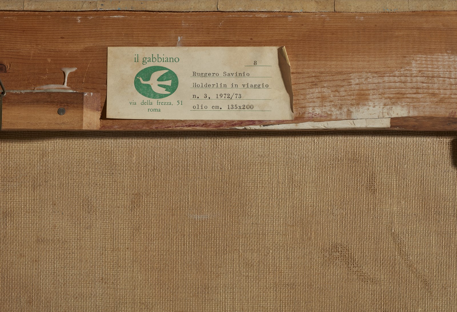 SAVINIO RUGGERO (n. 1934) Holderlin in viaggio. 1972. Olio su tela . Cm 135,00 x 200,00. Firma e anno in basso a destra. Al retro cartiglio descrittivo Galleria Il Gabbiano, Roma. Provenienza: Galleria Bergamini, Milano; Galleria Gabbiano, Roma; Christie's, 2002; Collezione privata, Roma. Esposizione: Savino, Galleria Comunale d'Arte Moderna, Conegliano Veneto, Ottobre - Dicembre 1992.