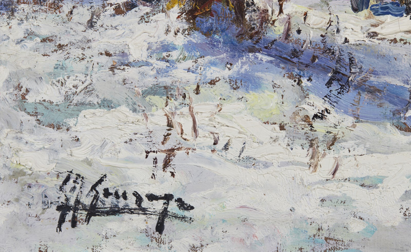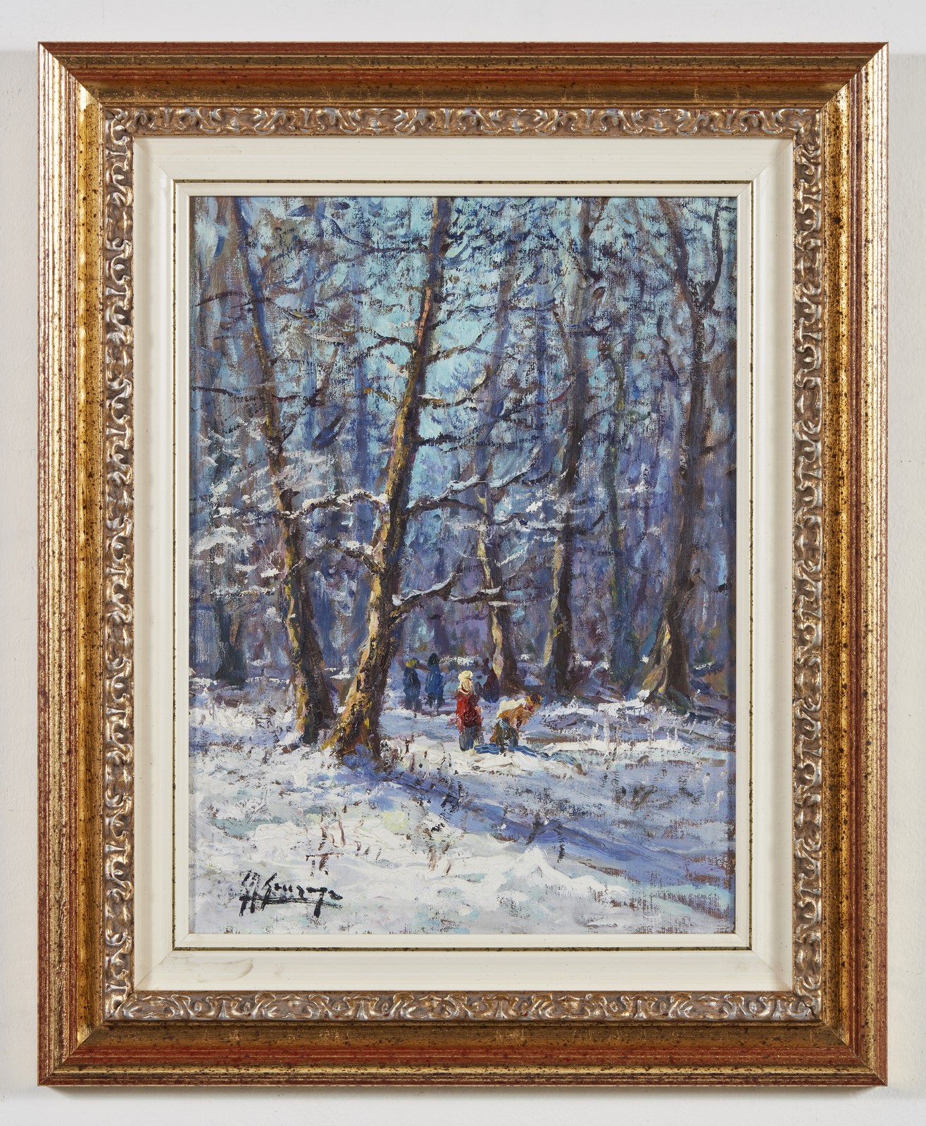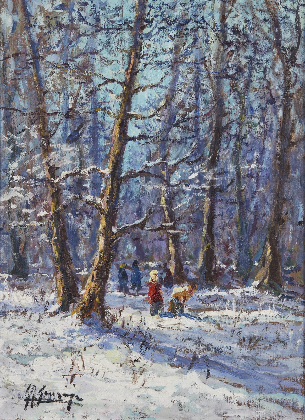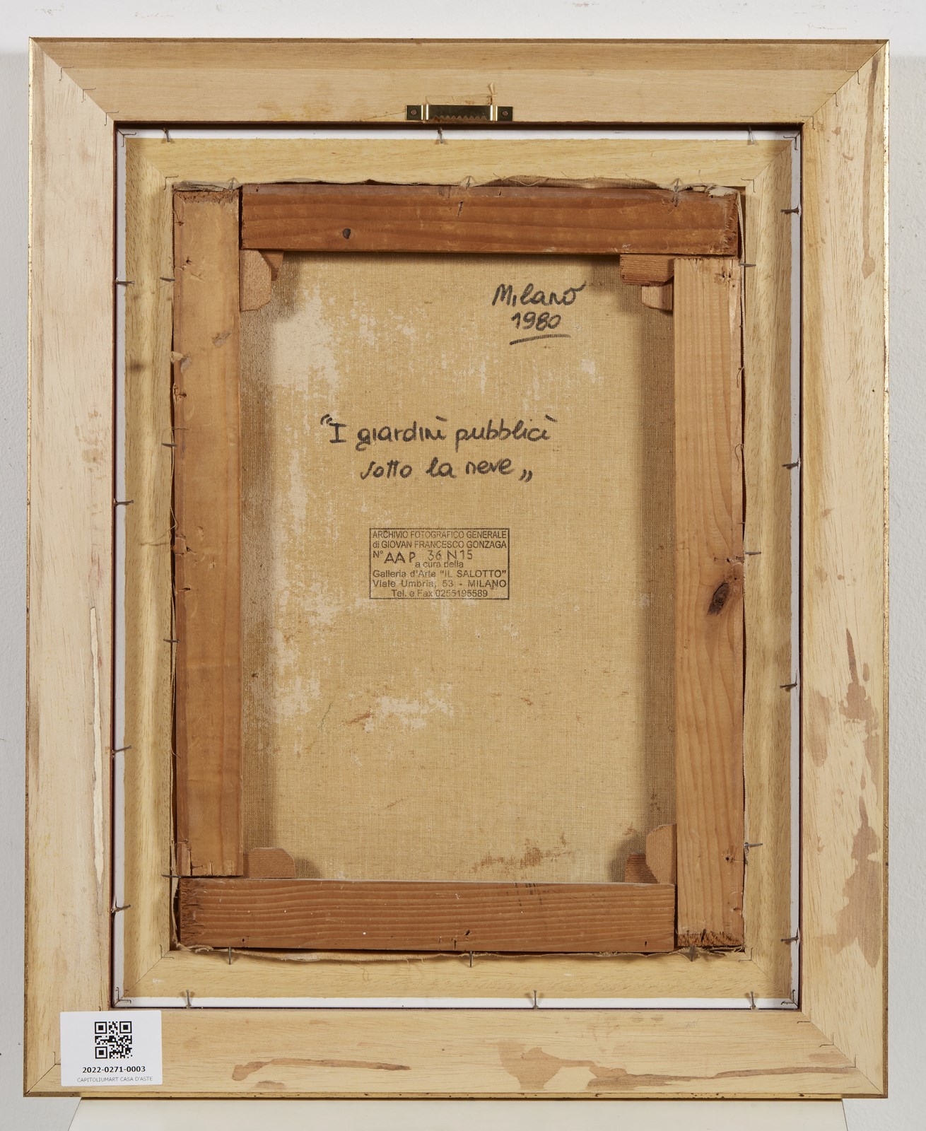 GONZAGA GIOVAN FRANCESCO (1921 - 2007 circa) I giardini pubblici sotto la neve. 1980. Olio su tela . Cm 30,00 x 40,00. Firma in basso a sinistra. Al retro titolo, firma e timbro Archivio Fotografico Francesco Gonzaga. Opera archiviata presso la Galleria Il Salotto, Milano - Rosa Riccioli Gonzaga, come da documentazione fotografica allegata all'opera riportante il relativo numero d'inventario. Lievi difetti. . Cornice presente