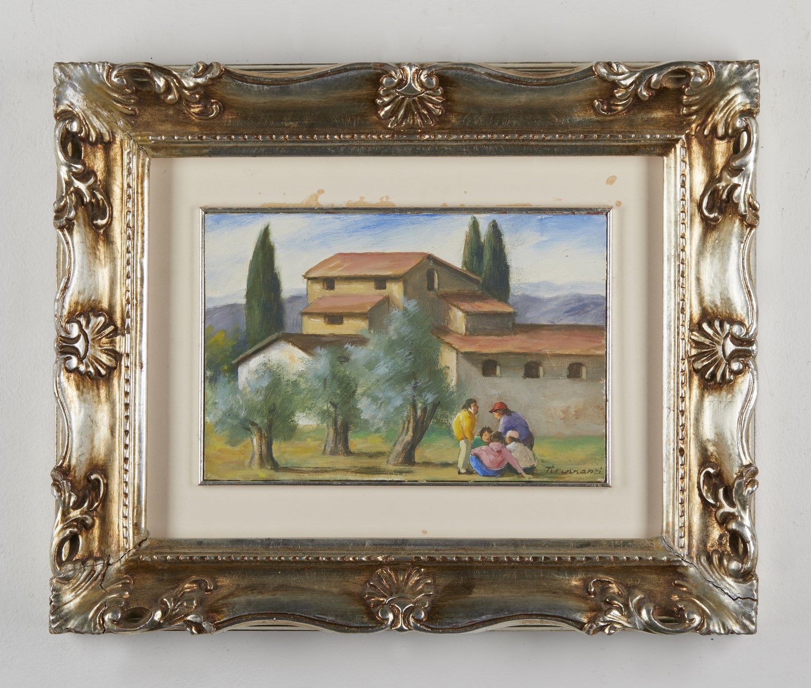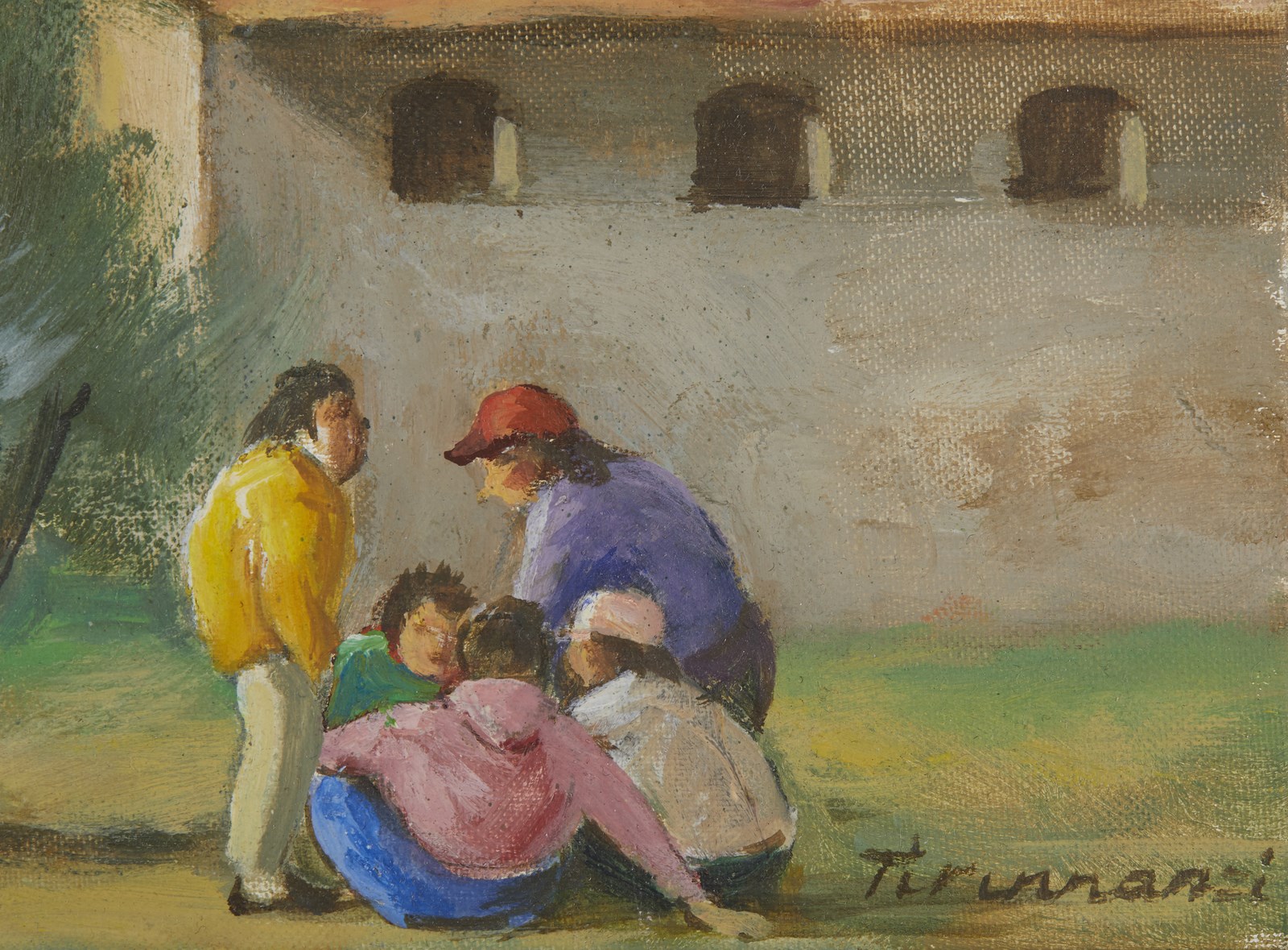 TIRINNANZI NINO GIOVANNI (1923 - 2002) Ragazzi in campagna. . Olio su cartone. Cm 30,00 x 20,00. Firma in basso a destra. Certificato di autenticità e provenienza dell'opera Vannucchi Arte, Prato. Autentica dell'artista su fotografia. . Cornice presente