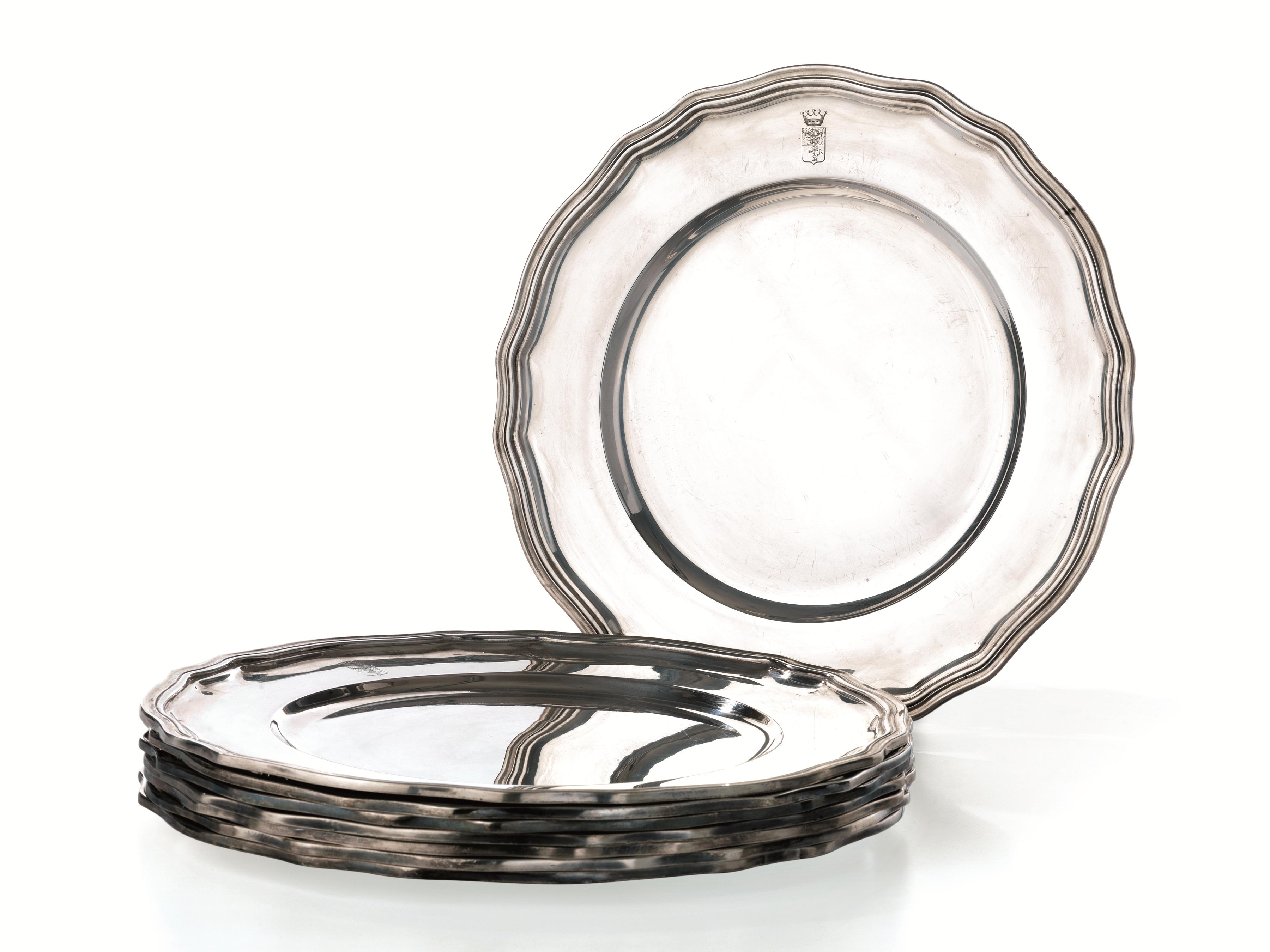 Otto sotto piatti, Miracoli, in argento, tesa sagomata con stemma nobiliare inciso, diam. cm 29, g 5635