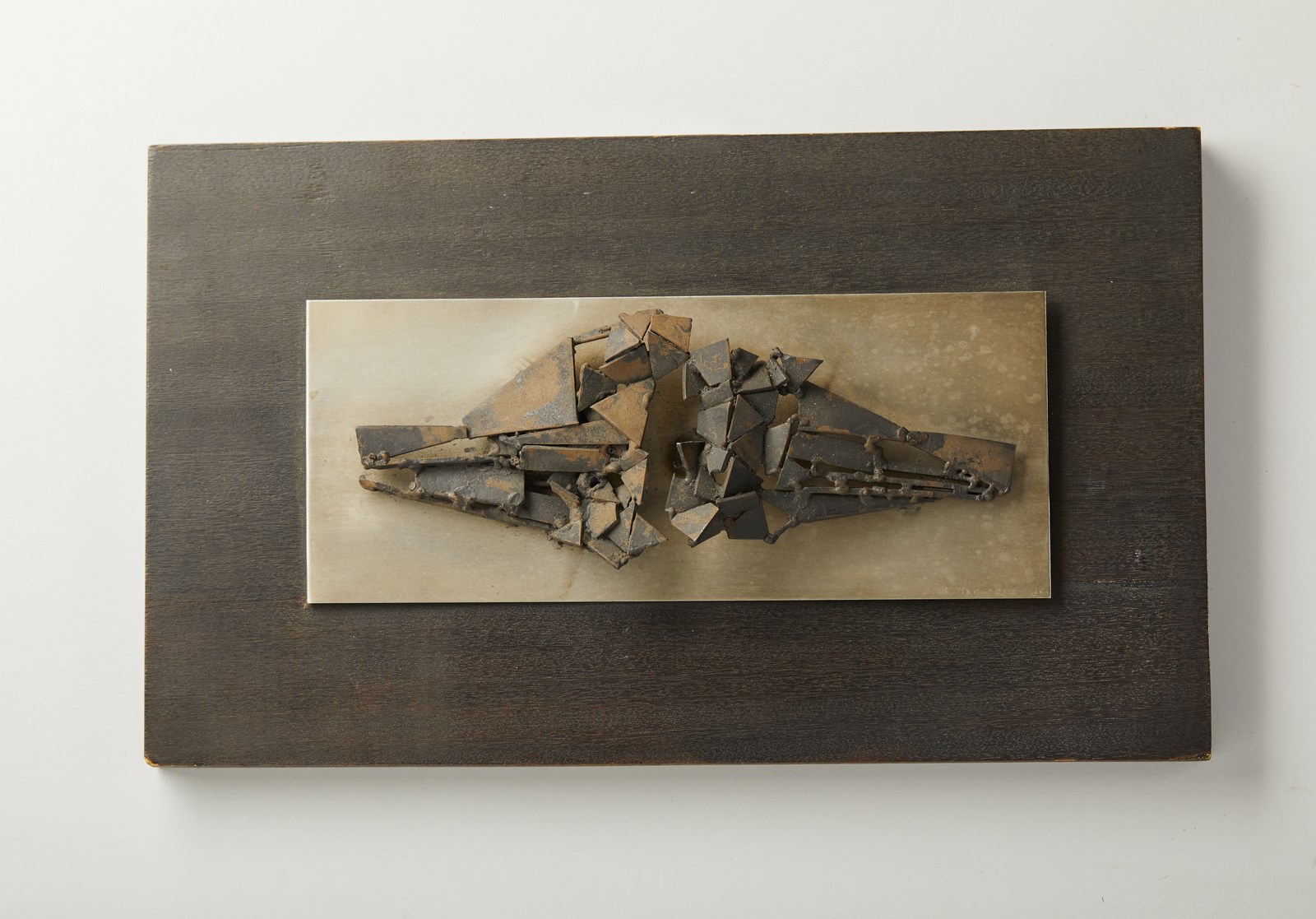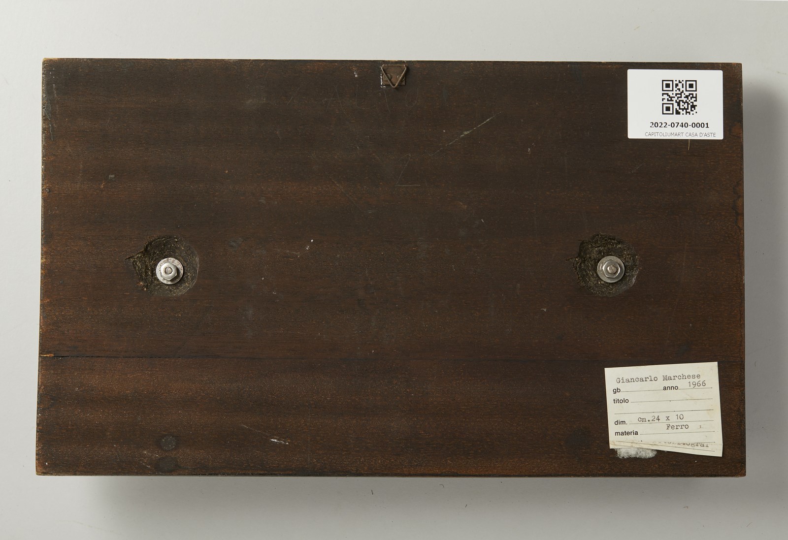 MARCHESE GIANCARLO (n. 1931) Senza titolo. . 1966. Alluminio e ferro. Cm 27,00 x 11,00. Firma e anno incise in basso a destra. Cartiglio descrittivo al retro. Dimensioni con cornice: 23x39cm. Lievi difetti. . Cornice presente