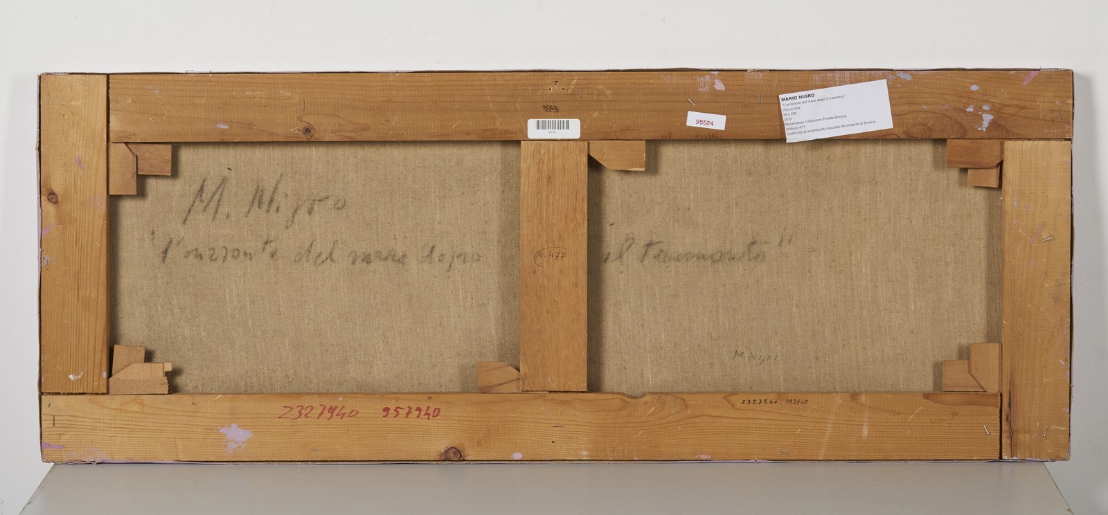 NIGRO MARIO (1917 - 1992) L'orizzonte del mare dopo il tramonto. 1970. Olio su tela . Cm 100,00 x 38,00. Al retro titolo e firma. Certificato di autenticità Vimarte, Brescia. Cornice presente