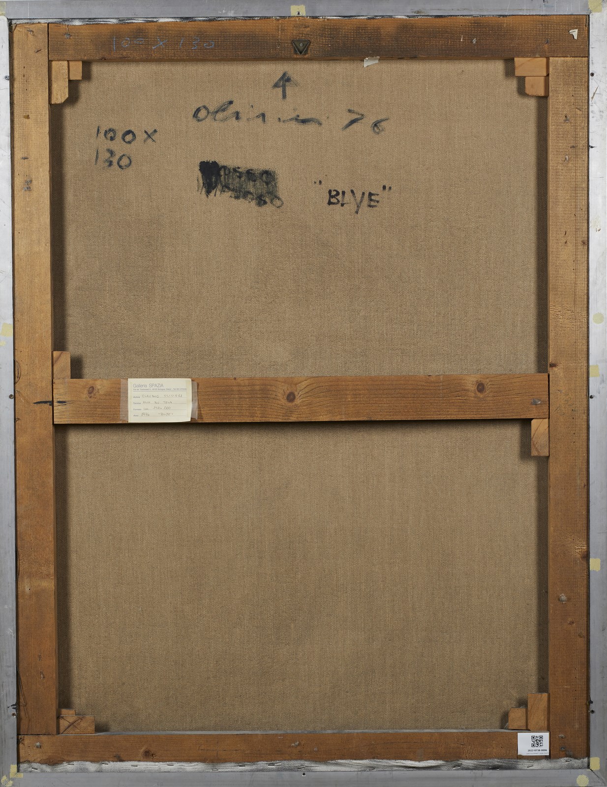 OLIVIERI CLAUDIO (n. 1934) Blye. . 1976. Olio su tela . Cm 100,00 x 130,00. Al retro titolo, firma, anno e cartiglio descrittivo Galleria Spazia, Bologna. Provenienza: Galleria Spazia, Bologna; Collezione privata. Difetti. . Cornice presente