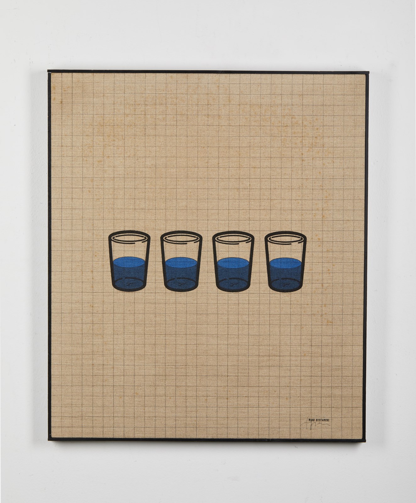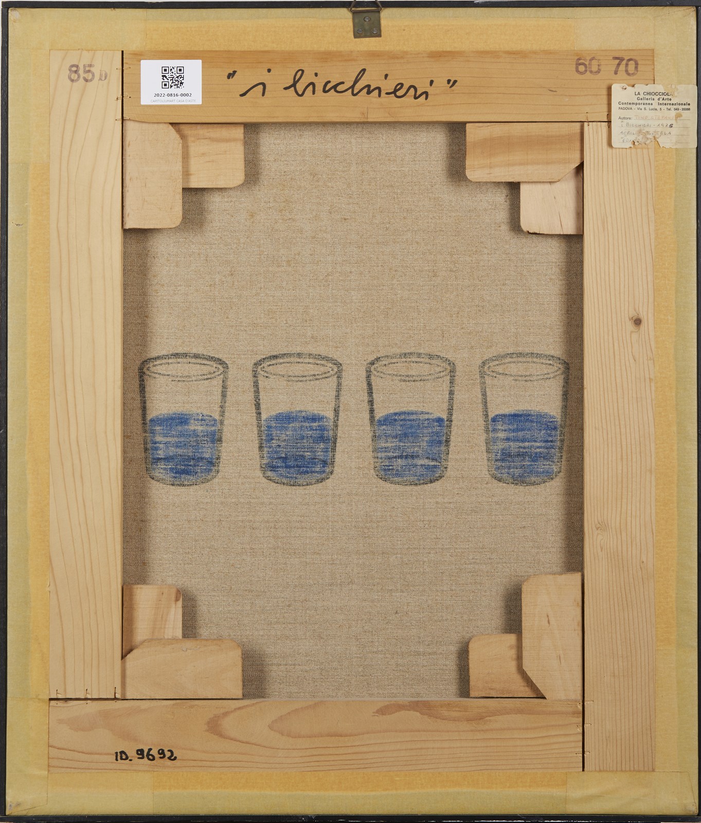 STEFANONI TINO (n. 1937) I bicchieri. . 1975. Tecnica mista su tela. Cm 70,00 x 60,00. Firma in basso a destra. Al retro titolo e cartiglio descrittivo Galleria La Chiocciola, Padova. Autentica dell'artista su fotografia e certificato di garanzia dell'opera rilasciato da Firenzeart Gallery. Lievi difetti. . Cornice presente