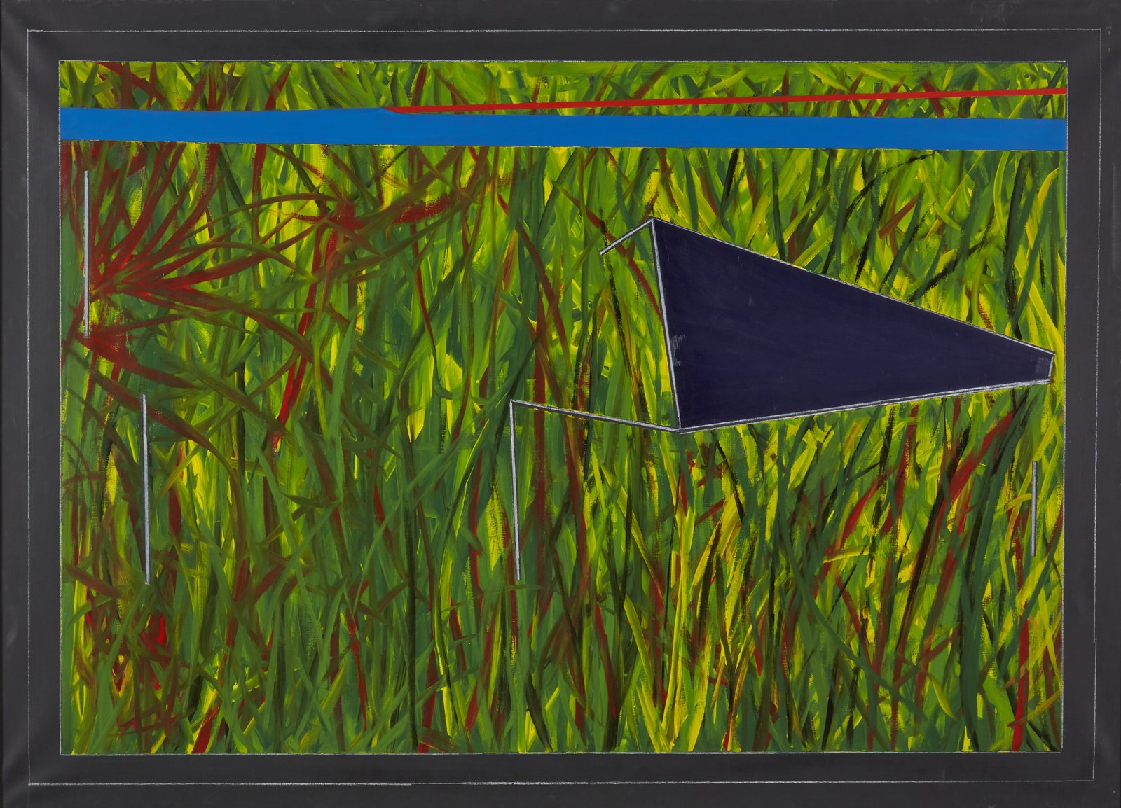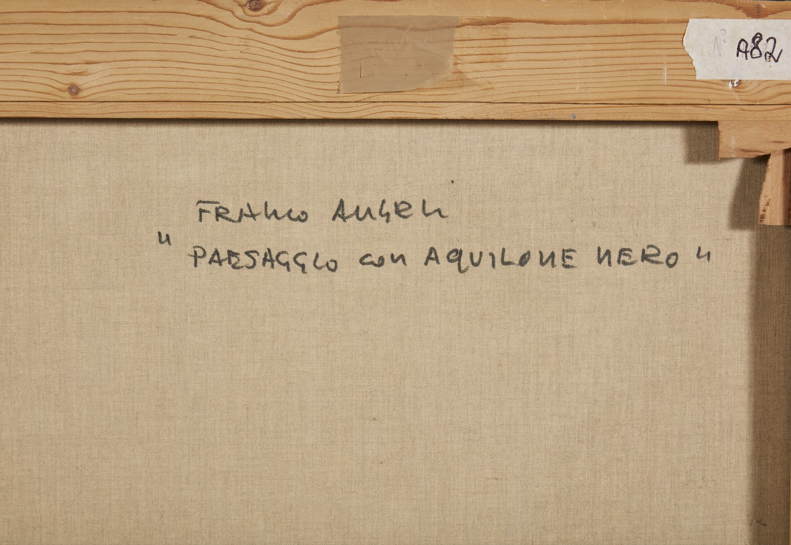ANGELI FRANCO (1935 - 1988) Paesaggio con aquilone nero. Tecnica mista su tela. Cm 180,00 x 130,00. Firma e titolo al retro. Opera archiviata presso l'Archivio Franco Angeli, Roma, come da documentazione fotografica allegata all'opera riportante il relativo numero d'inventario. 1985-1986. Difetti. Cornice presente